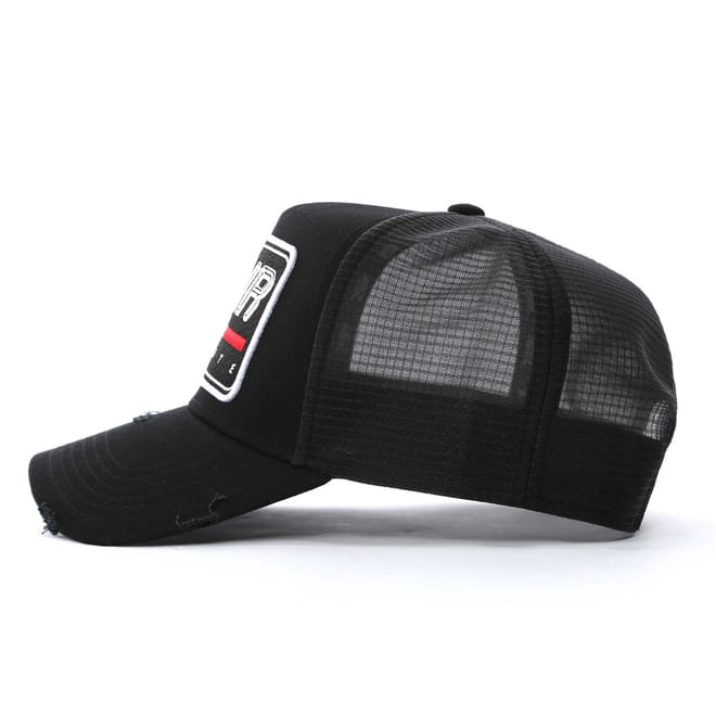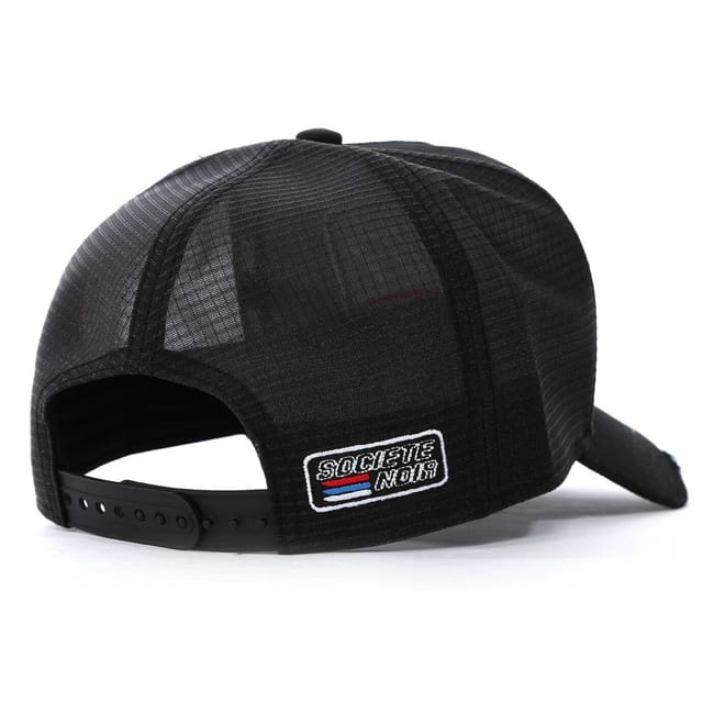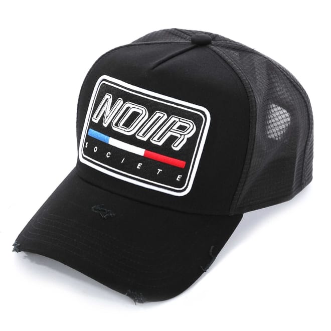 The Societe Noir Paris trucker cap features a stylish snap-back closure for a comfortable fit. Adorned with a patch and embroidered logo, this cap showcases distinctive lettering, making it a standout accessory. Perfect for those who appreciate a blend of fashion and functionality. -