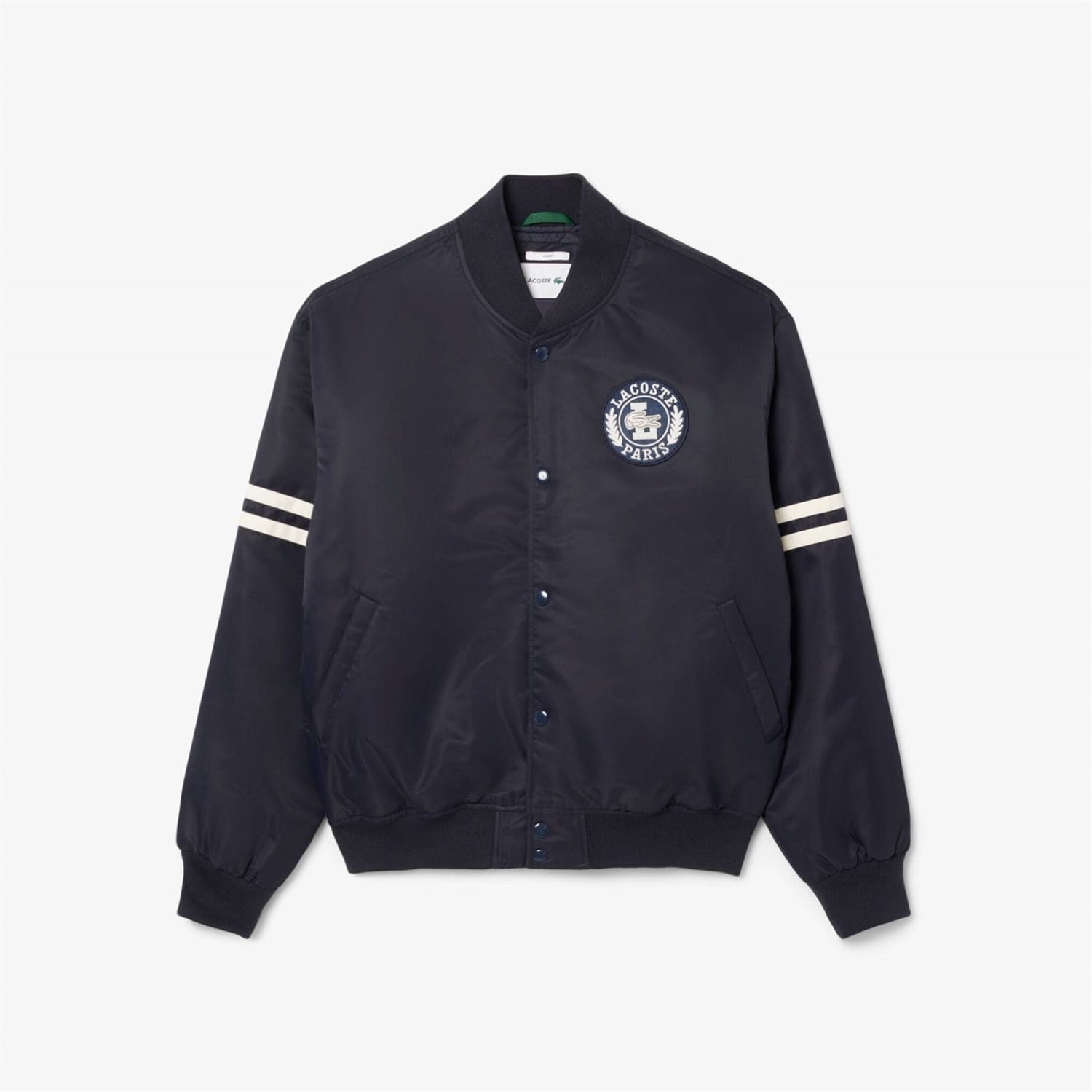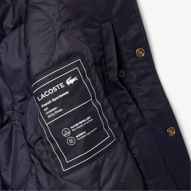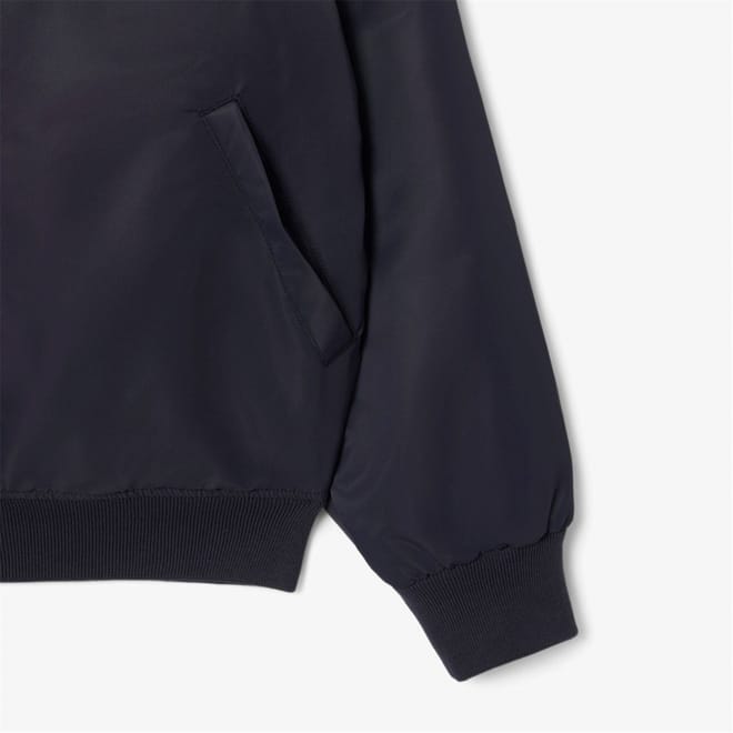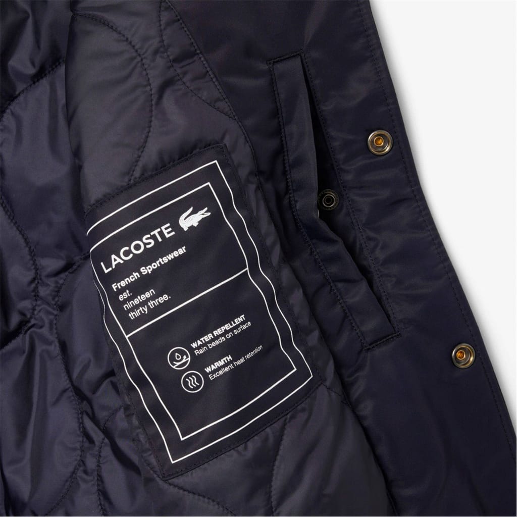 This Lacoste bomber jacket features a water-repellent finish, making it a practical choice for unpredictable weather. The short length and regular fit offer a classic silhouette, while the bomber collar and ribbed hem add a touch of style. Embellished with a badge and embroidered logo, this solid pattern jacket is completed with a snap and zipper closure for convenience. -