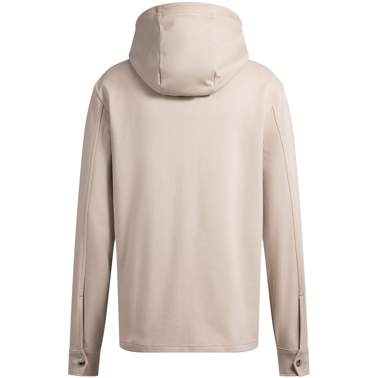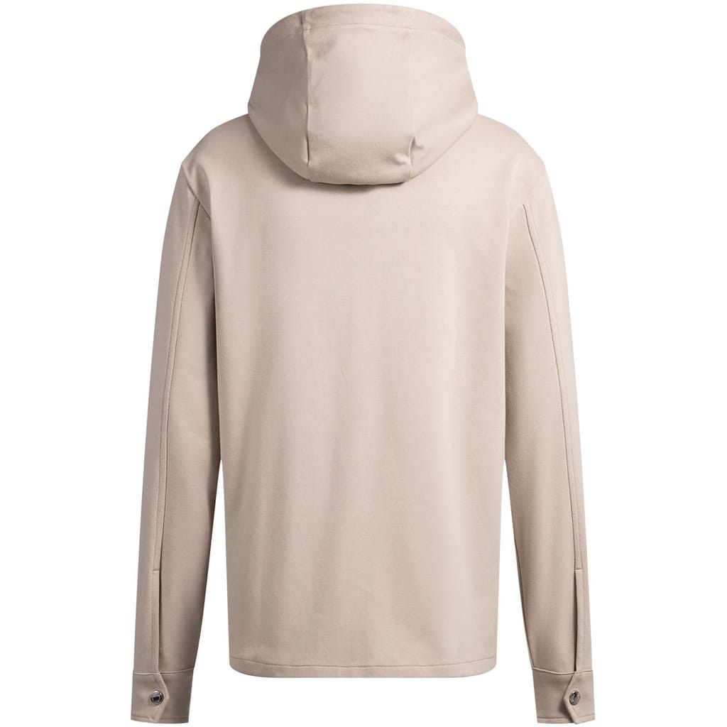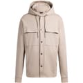This Boss overshirt jacket is designed with a hooded neckline and a sleek, solid pattern. It features a regular fit and snap button closure for a stylish yet practical look. The jacket is equipped with functional pockets, including a chest pocket, adding utility to its design. -