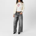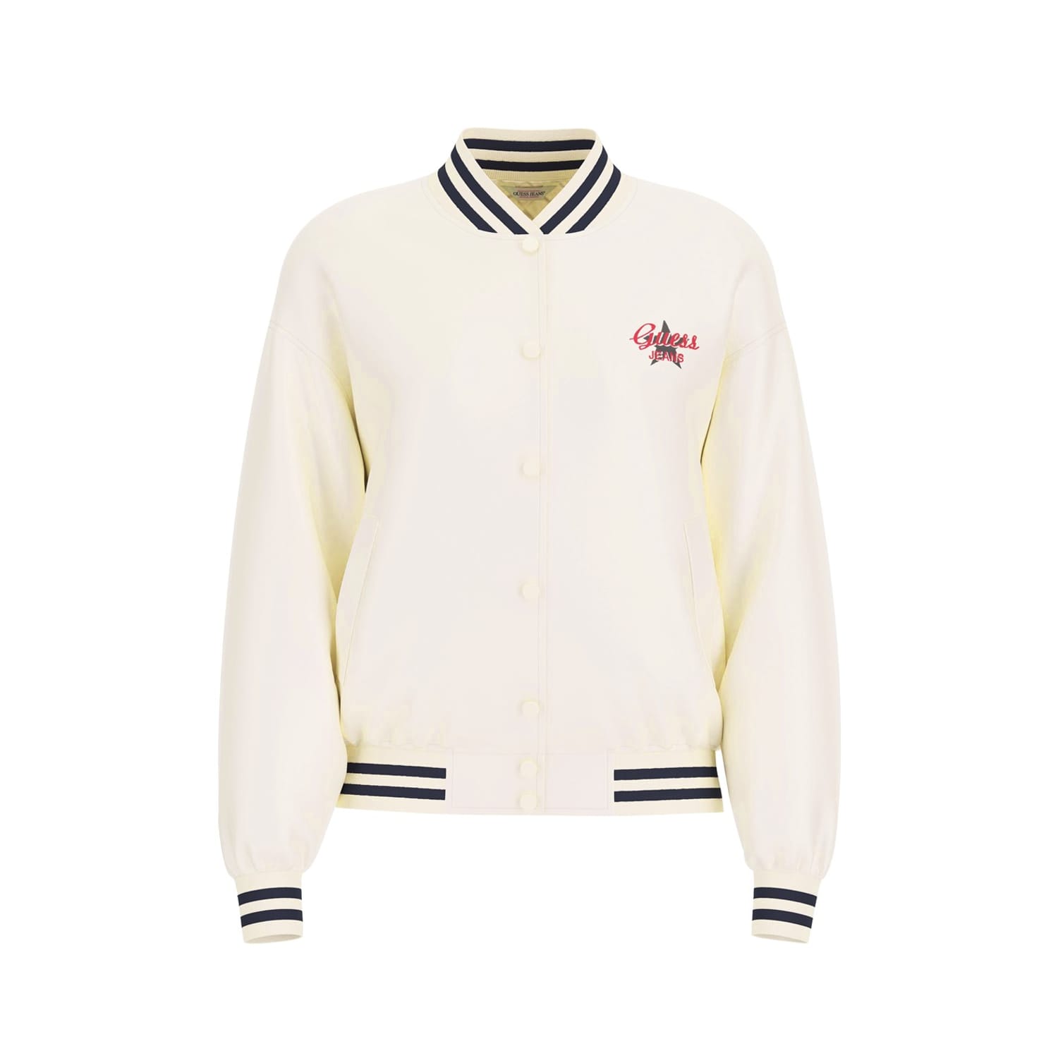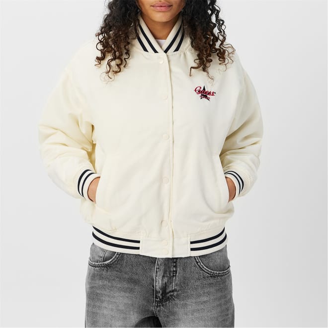This Guess bomber jacket is a casual staple with a short length and relaxed fit. It features a ribbed crew neck and bomber collar, complemented by a ribbed hem and cuffs. The snap button closure adds a classic touch, while the large graphic print and embroidered logo provide distinctive style. -