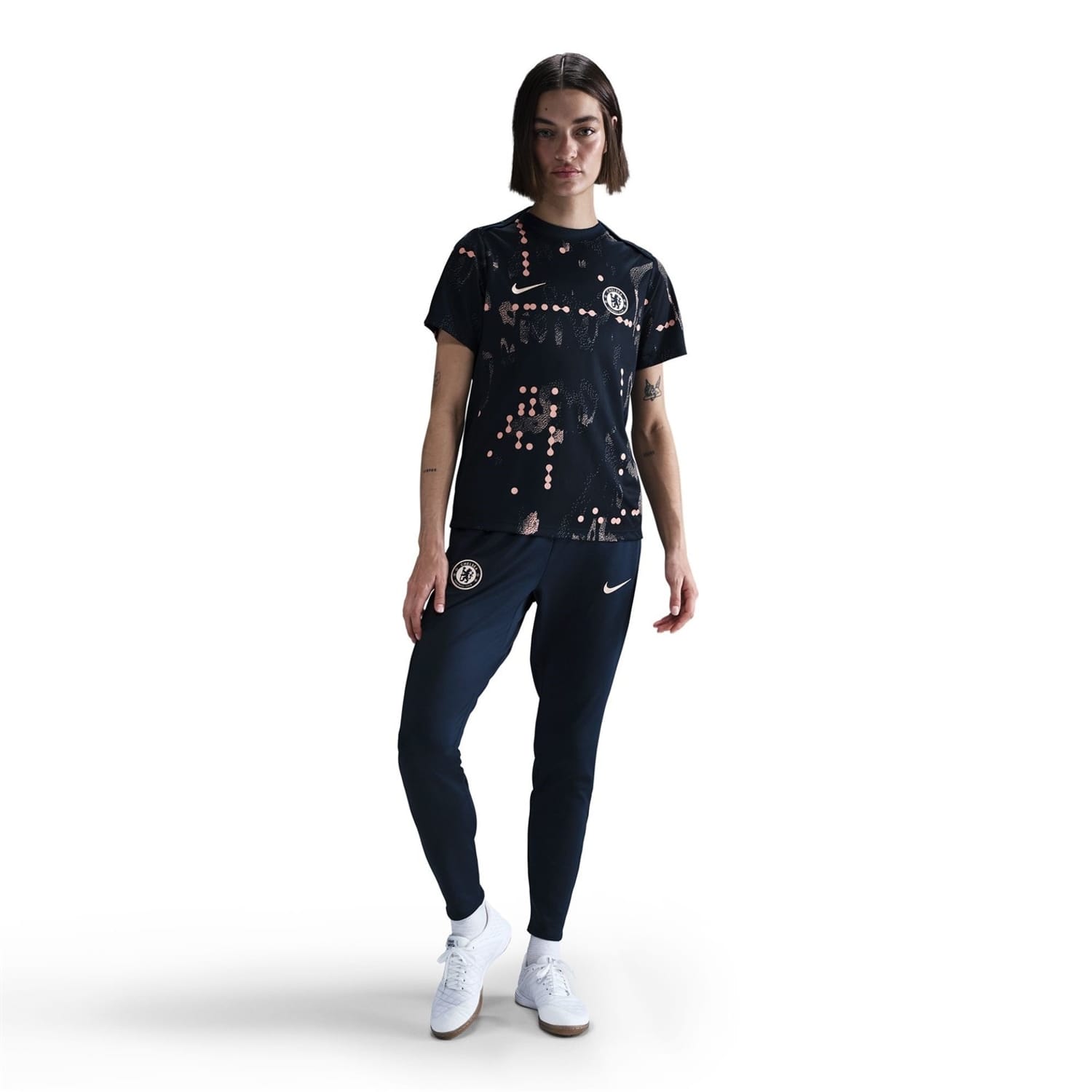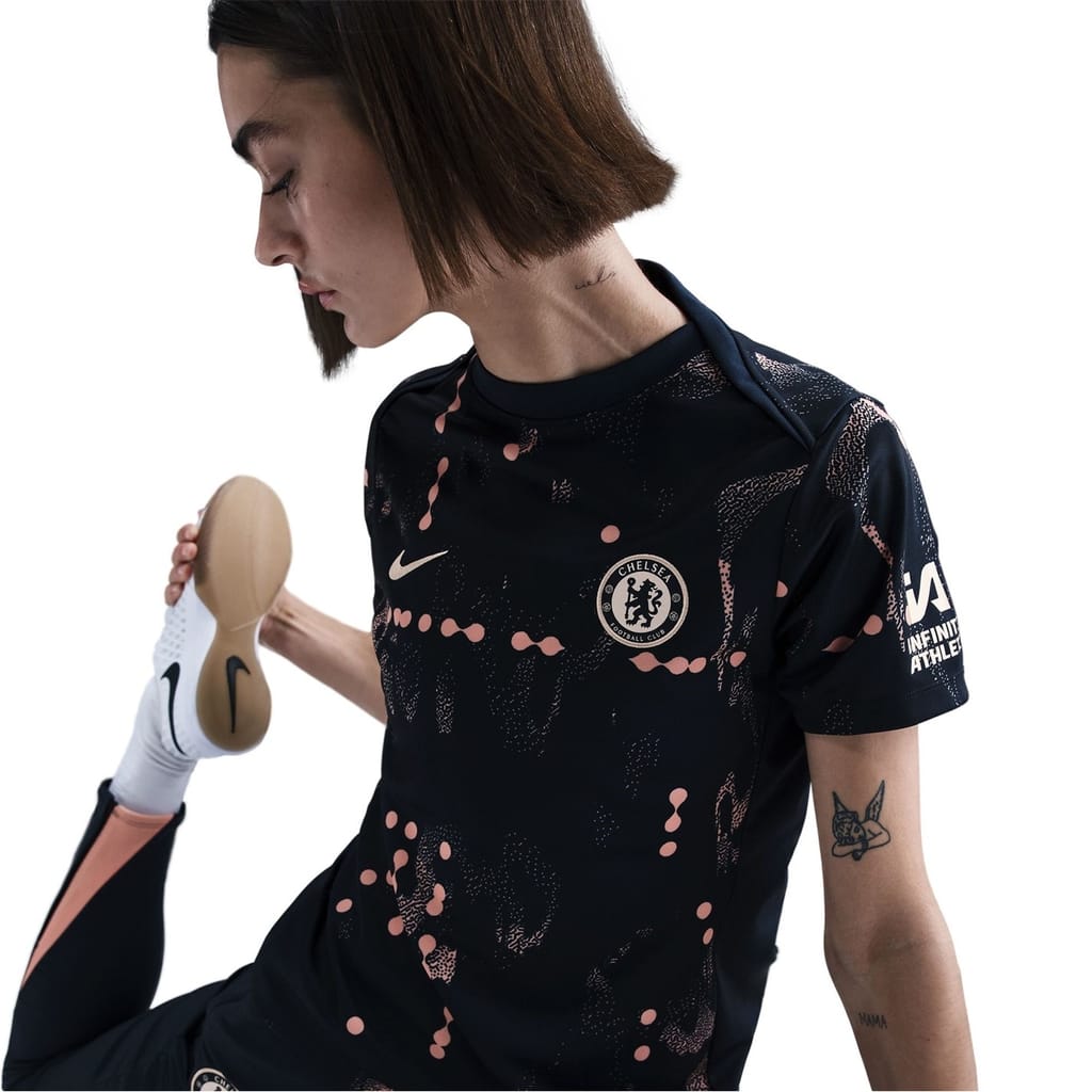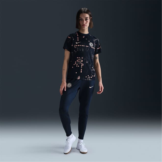 This Nike top is a must-have for Chelsea fans, featuring a graphic print and a crew neck design. Crafted for all seasons, it offers a regular fit with short sleeves. The top is part of the pre-match and sporting activity collections, showcasing a licensed logo embellishment. -
