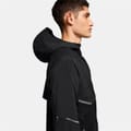 The On running jacket is designed for performance, featuring a hooded neckline and a zipper closure. It includes a straight hem and elasticated cuffs for a regular fit. The solid pattern is complemented by a logo and reflective ribbon embellishments, making it ideal for activewear and sporting activities. -