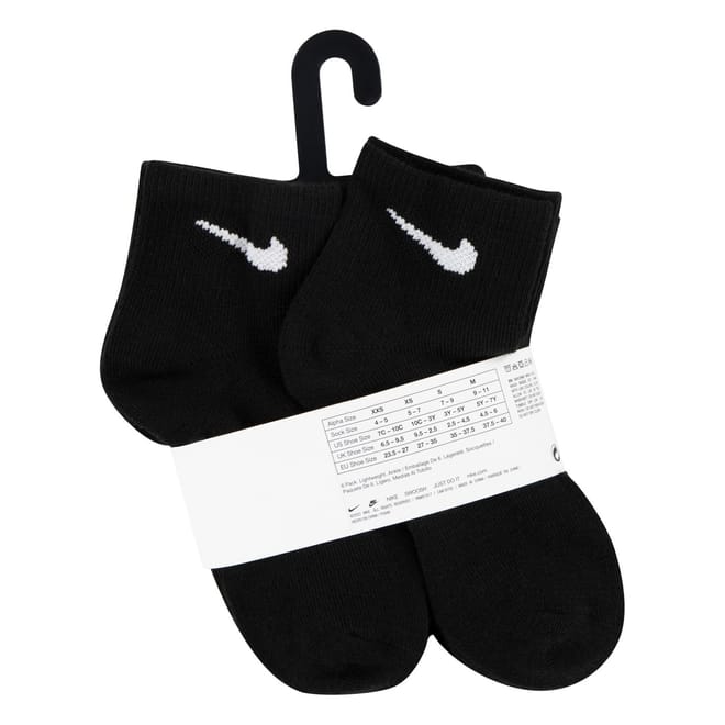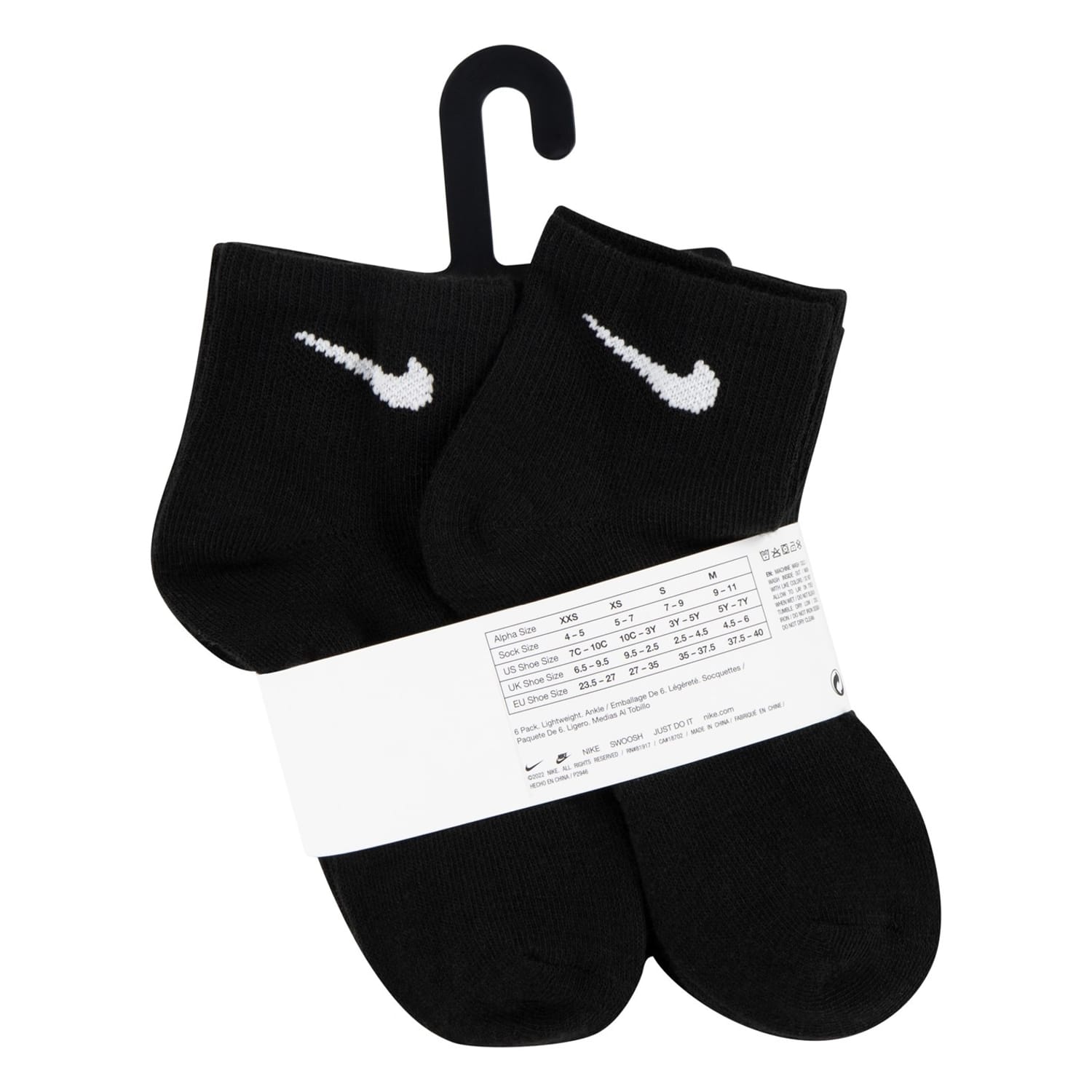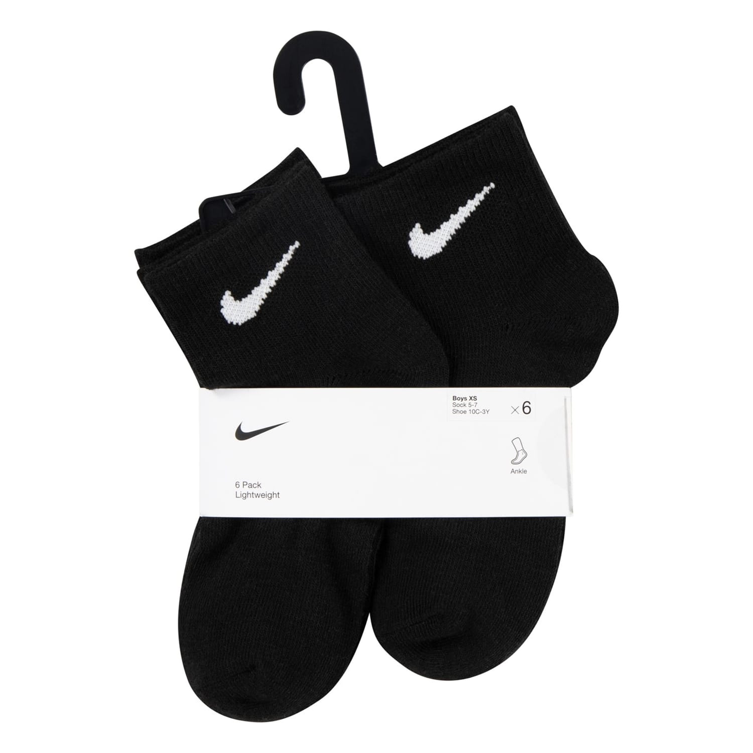 The Kids Nike 6 Pack Ankle Socks are perfect for everyday wear, featuring a lightweight fabrication coupled with a ribbed trim to the top and flat lock seam to the toes that ensures all day comfort, a solid colouring along with the Nike Swoosh branding completes the look. Machine washable, follow care label instructions. -
