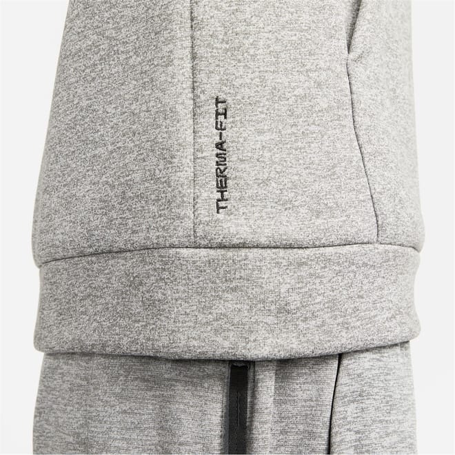 This Nike top from the activewear collection features a hooded design with a drawstring closure. Crafted for performance, it boasts a relaxed fit with long raglan sleeves and ribbed cuffs. The heathered pattern adds a stylish touch, while the logo and pocket embellishments enhance its functionality. -