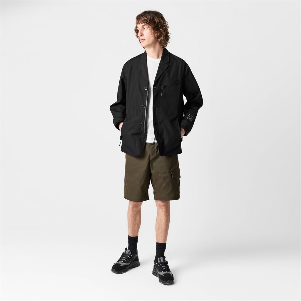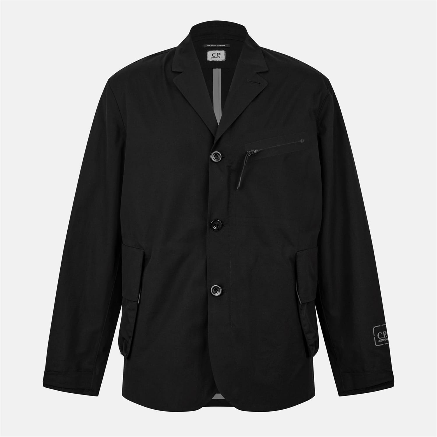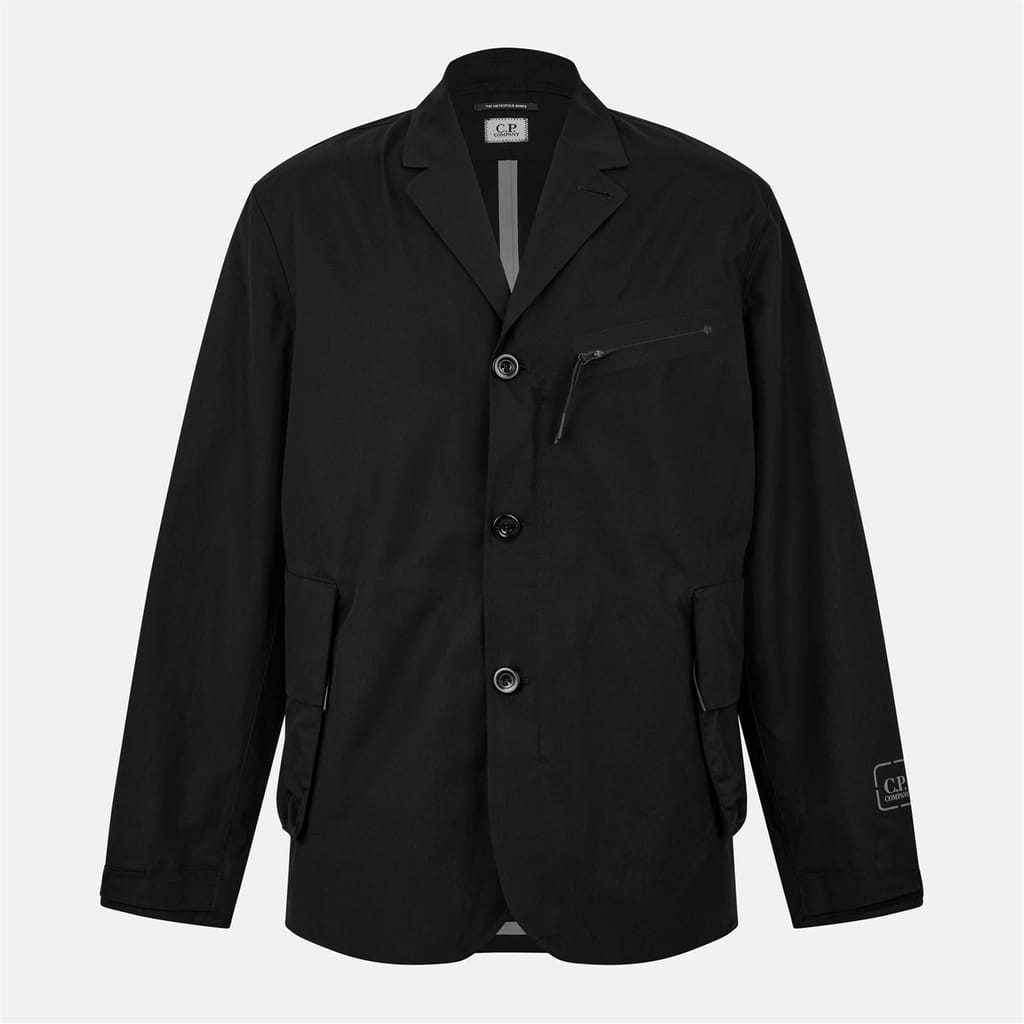 This C.P. Company blazer is a staple in the workwear collection. Crafted with a notch collar and a straight hem, it features a button closure for a classic look. The regular fit and short length ensure comfort and style. Embellished with a logo, it includes practical chest and side pockets. The solid pattern adds a touch of sophistication to this versatile piece. -