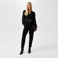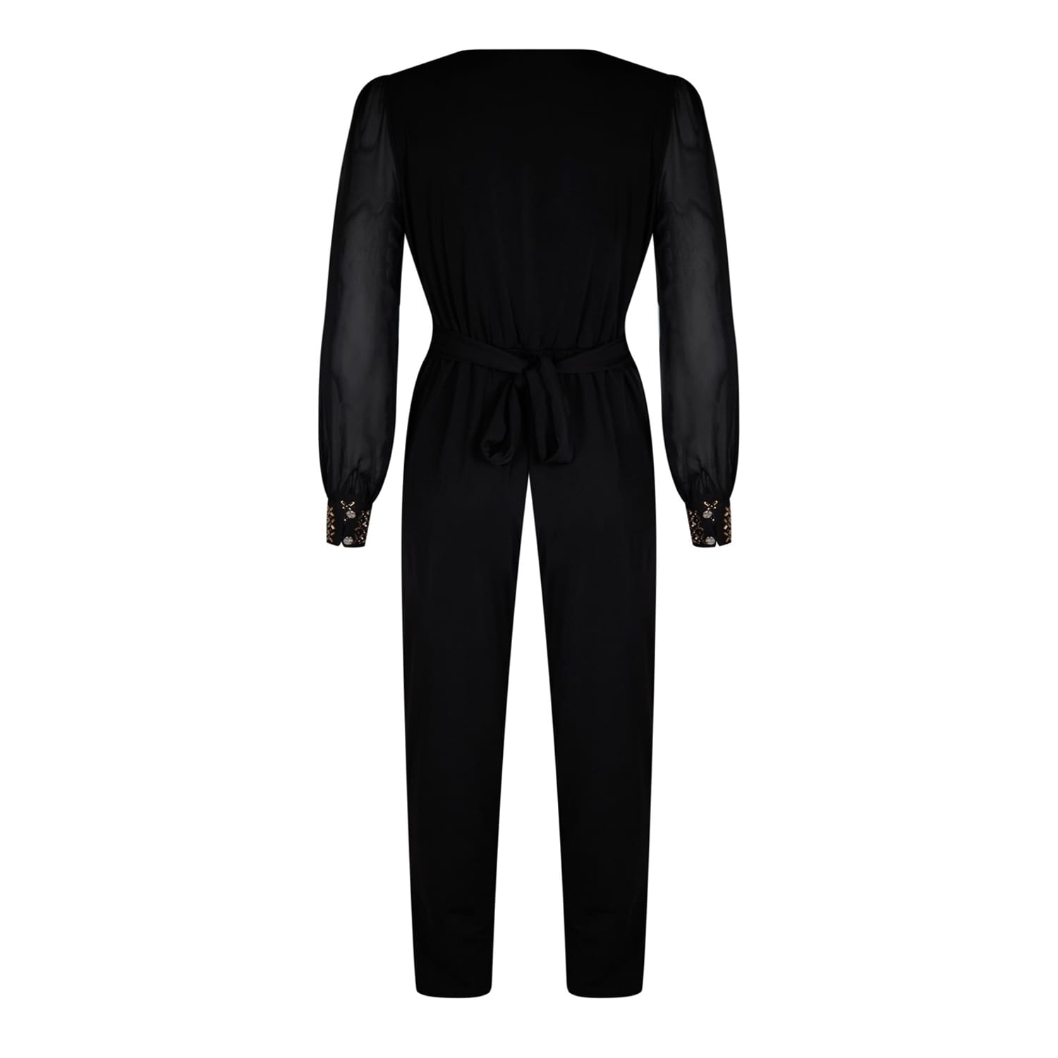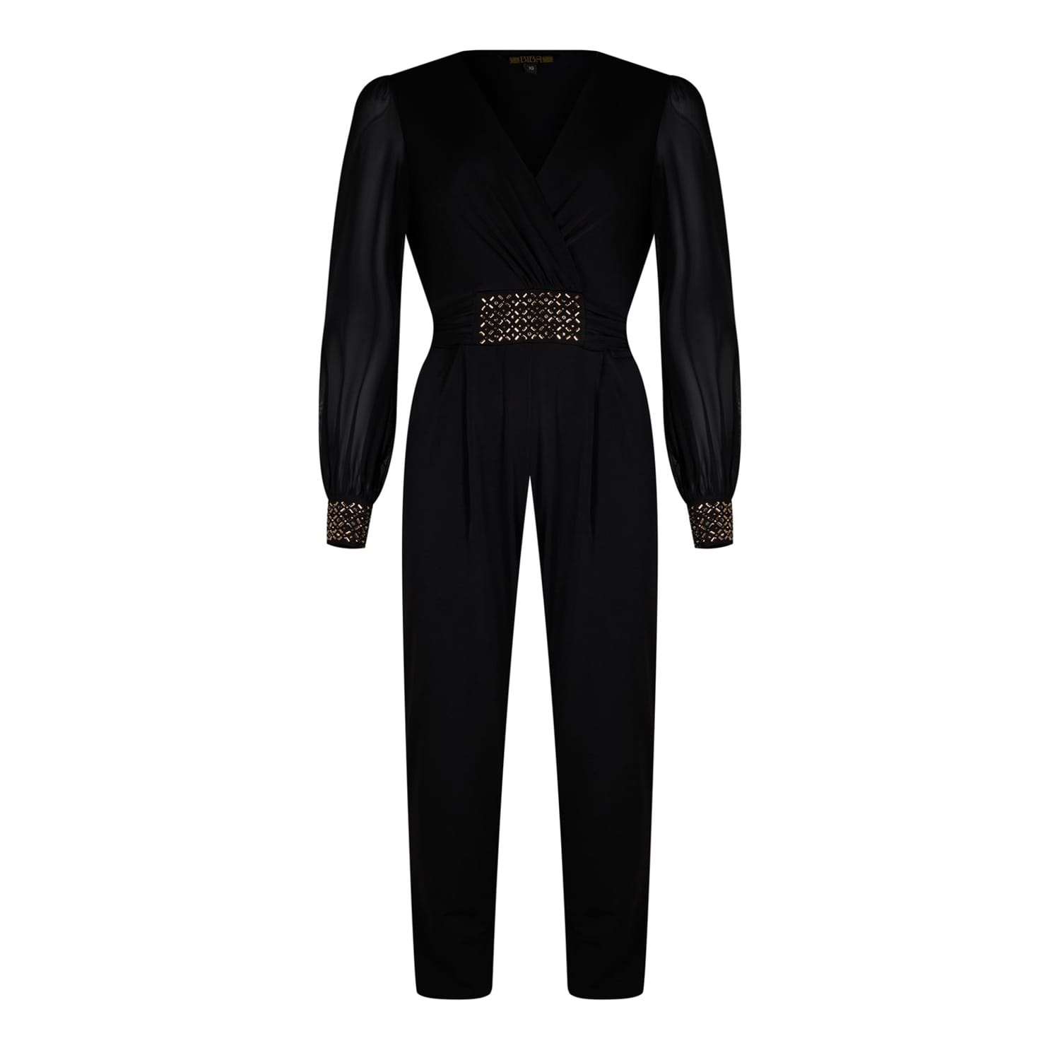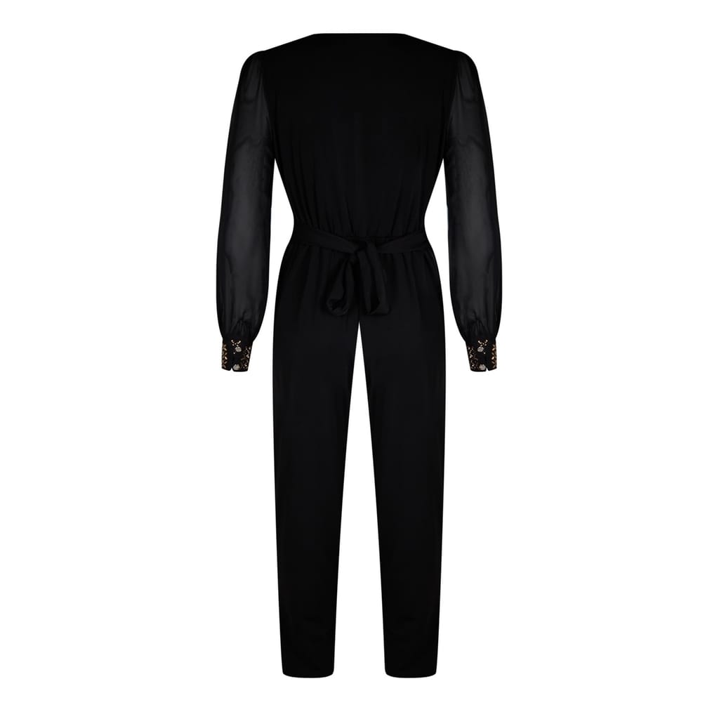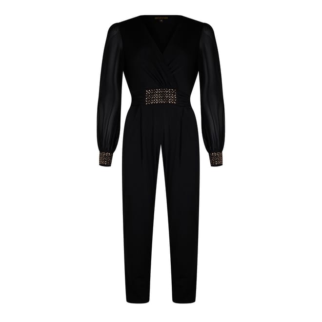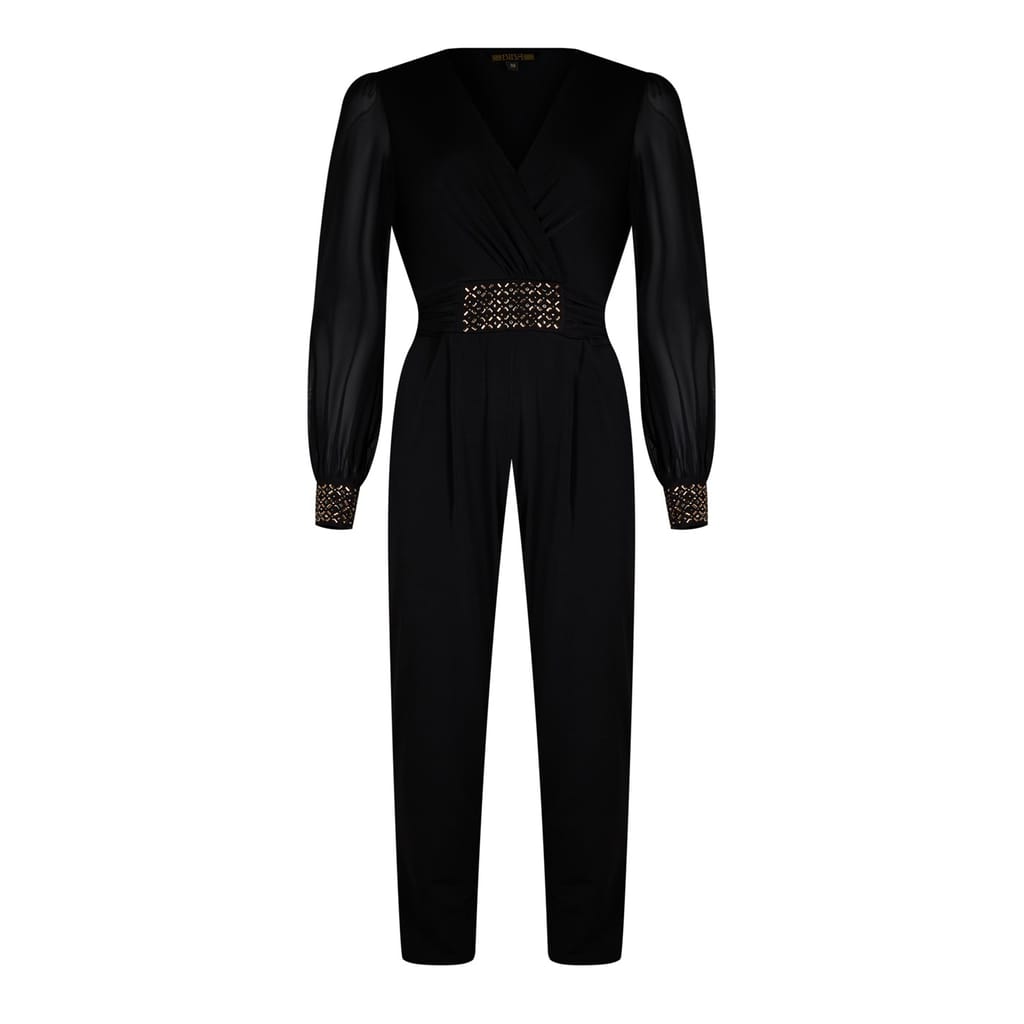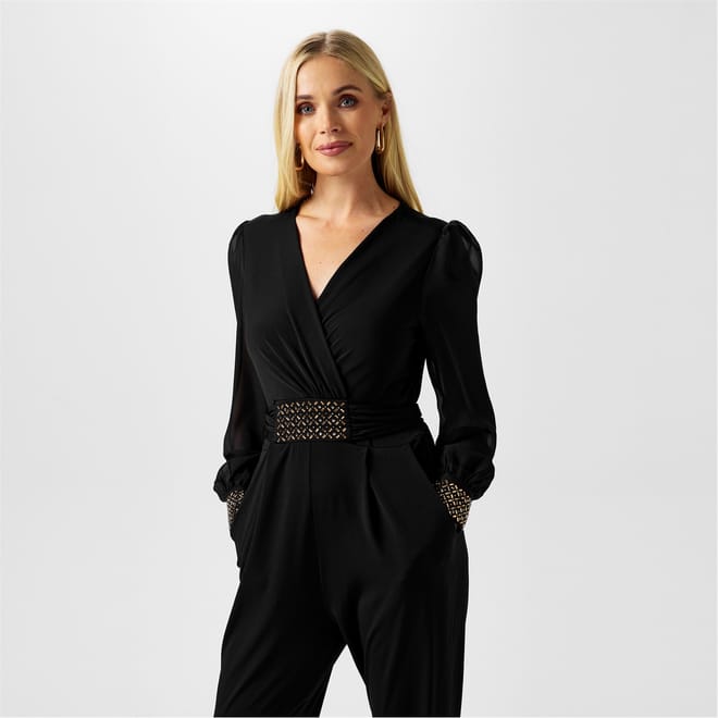 Elevate your party wardrobe with the Biba Embellished Jumpsuit. This striking piece boasts a wrap-over neckline and a dazzling embellished waist detail, creating a figure-flattering silhouette. Sheer sleeves with embellished cuffs add a touch of elegance, while the straight-leg cut offers a modern and polished finish. Perfect for Christmas parties and glamorous events, this jumpsuit is a statement piece.