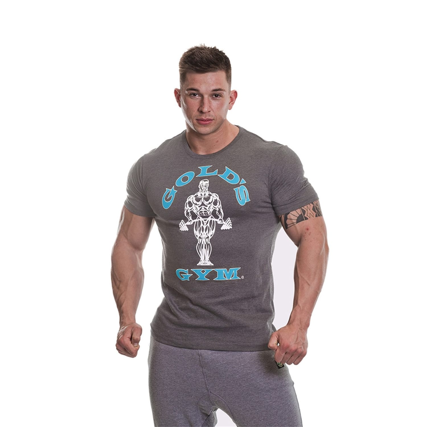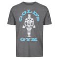 - Upgrade your gym wear with this iconic Muscle Joe T Shirt by Golds Gym, crafted from a mix of cotton and polyester fabric for a light weighted and all day comfort design. This t shirt features short sleeves, ribbed crew neckline and is finished with a large ionic Gold's Gym graphic embossed on the front for instant brand recognition. Material 60% cotton, 40% polyester. Machine washable at 40 degree -