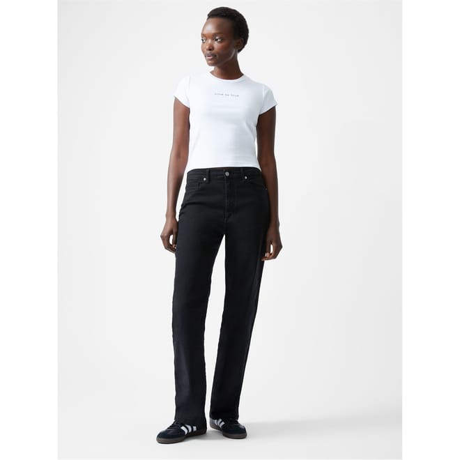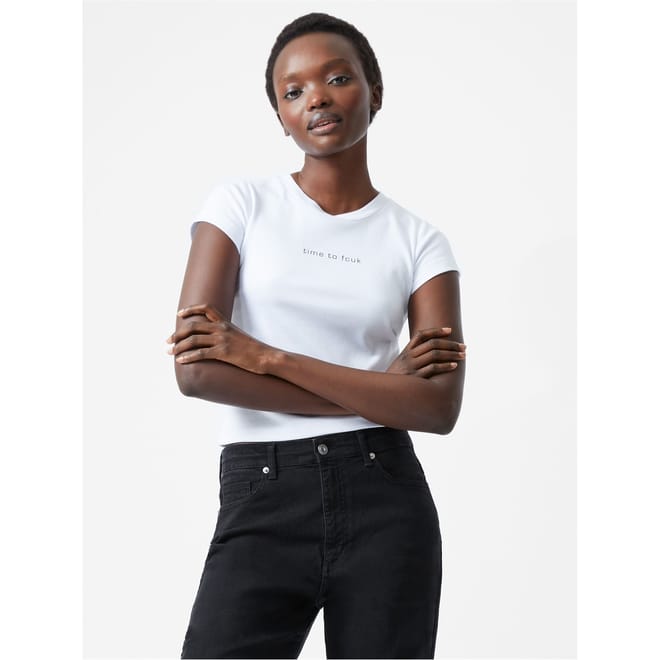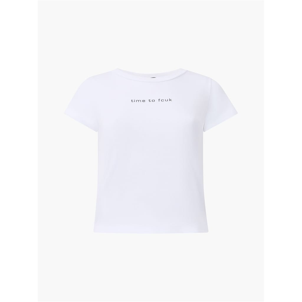 This FCUK cropped top from the casual collection features a crew neck and slim fit, offering a modern silhouette. The solid pattern is complemented by a distinctive logo embellishment and bold lettering graphic, making it a stylish choice for any wardrobe. -