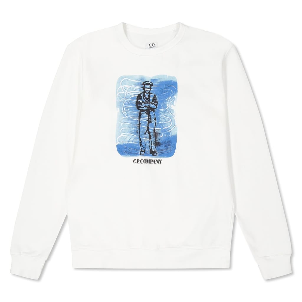This C.P. Company junior top features a graphic print and a crew neck design. The long sleeves are complemented by ribbed cuffs, offering a regular fit. The top is adorned with a logo embellishment, adding a distinctive touch. -