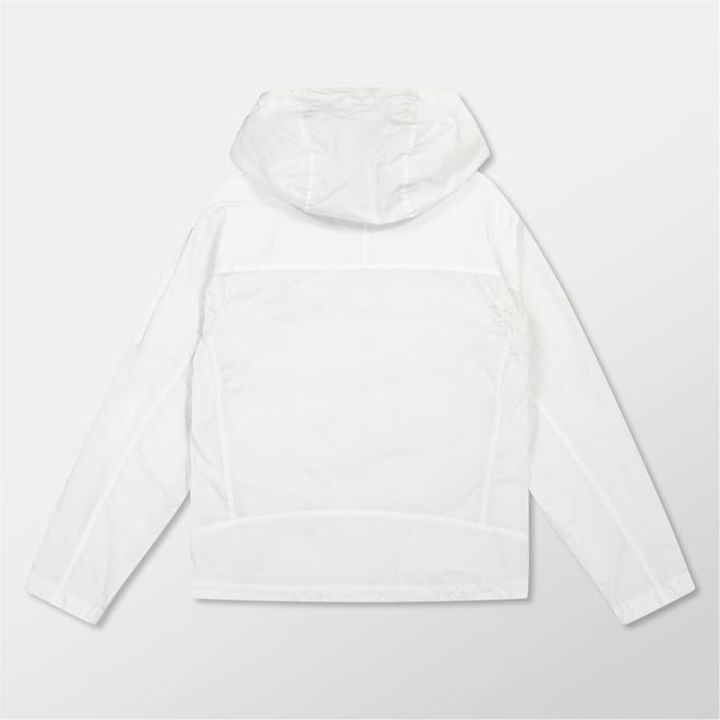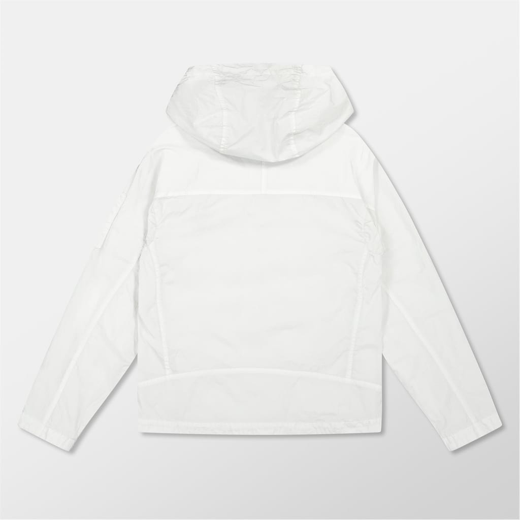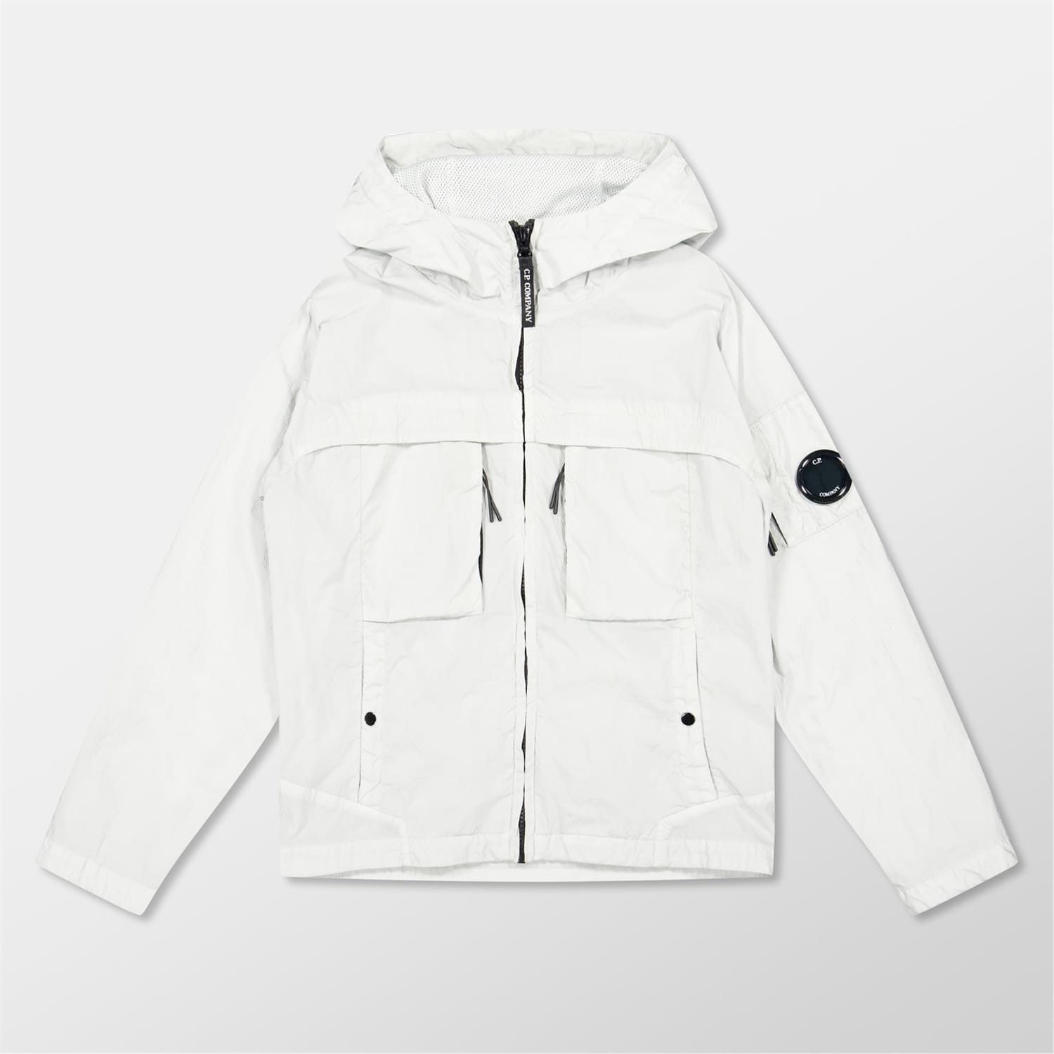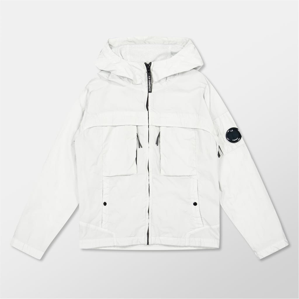 This C.P. Company rain jacket is designed with a hooded neckline and a zipper closure, offering a regular fit. It features a solid pattern and a straight hem, with practical pockets and a logo embellishment. The jacket is water-repellent, making it ideal for wet weather conditions. -