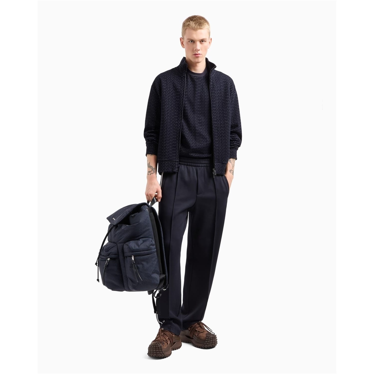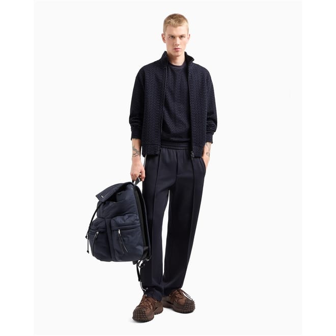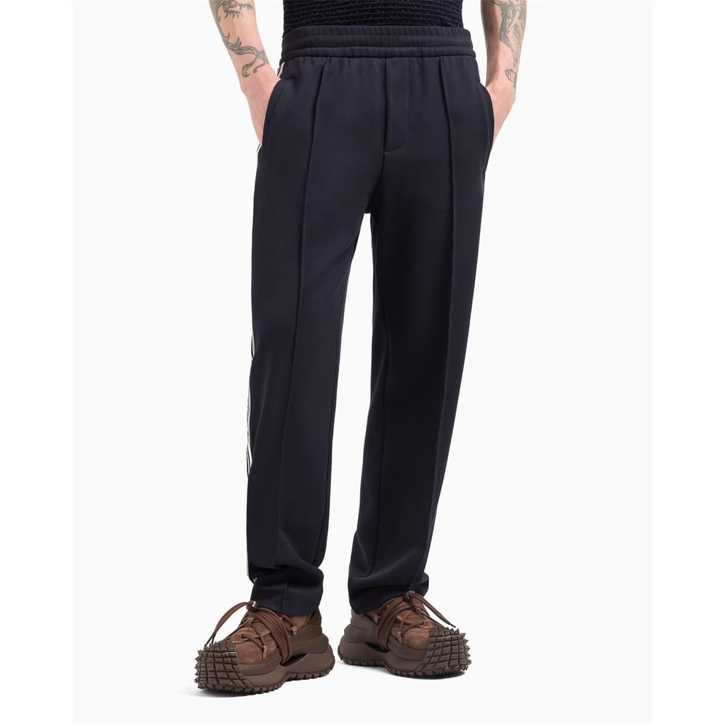 Emporio Armani track pants feature a woven design with an elasticated waistband for comfort. These trousers are adorned with side stripes and pockets, offering both style and functionality. Perfect for a casual look, they combine practicality with a touch of elegance. -