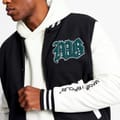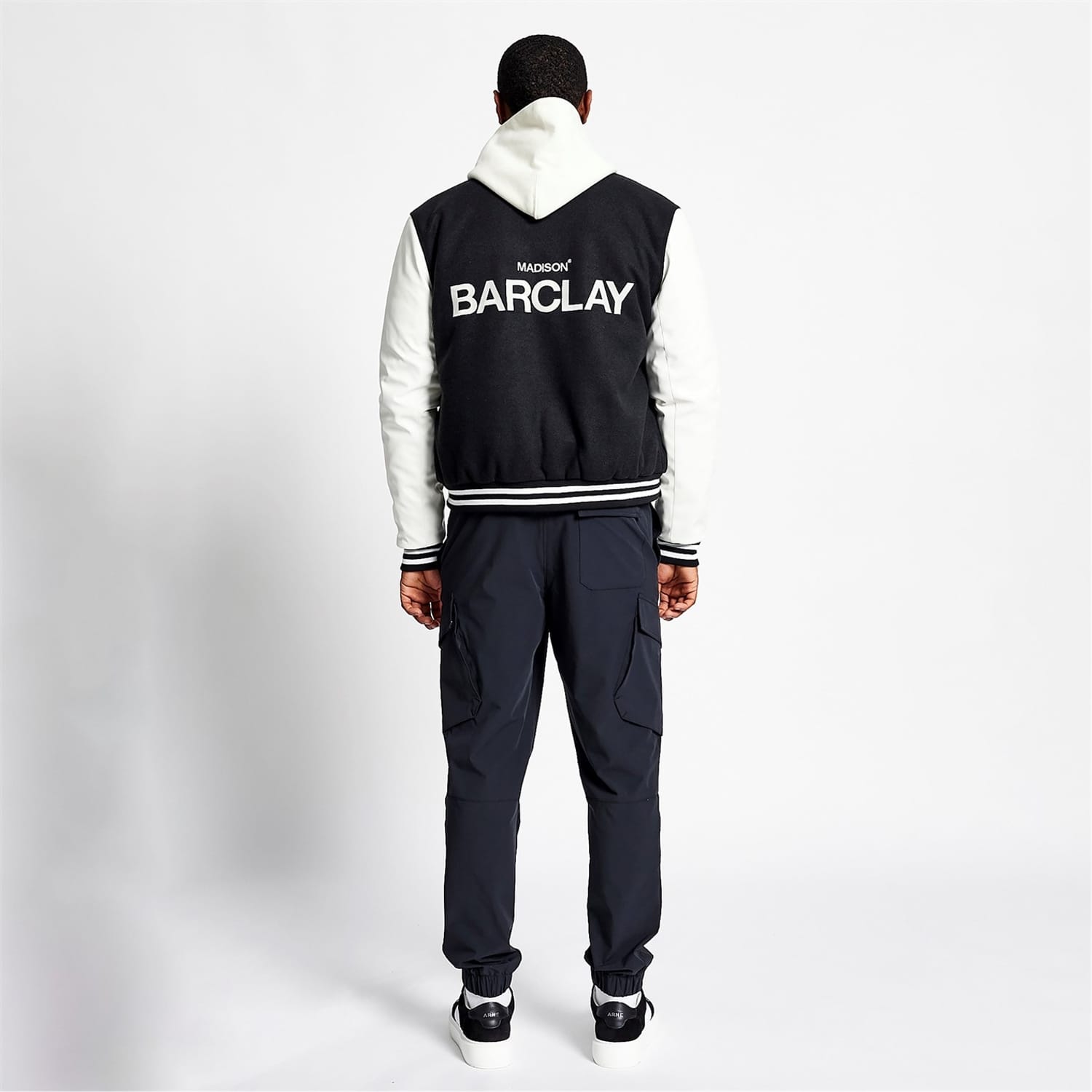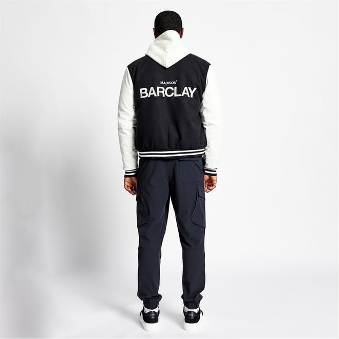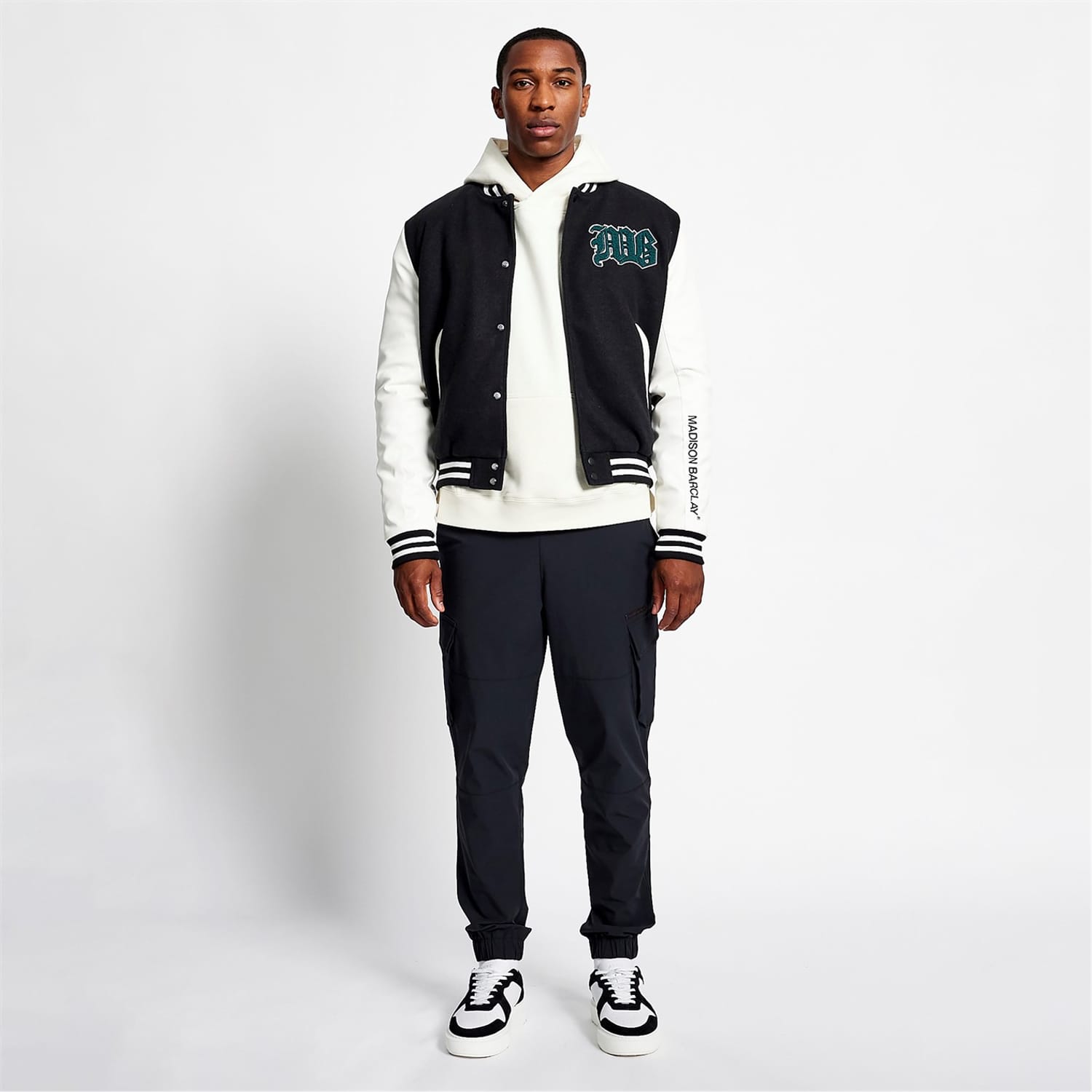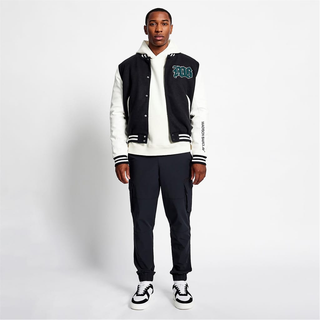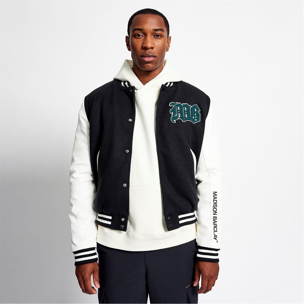 The Lincoln Baseball Jacket from Madison Barclay is crafted in a wool mix felt blend finished with faux leather sleeves inspired by the classic New York style baseball jacket. Featuring a forest green embroidered MB chest logo and branded sleeves. Complete with a stipe rib cuff and hem welt, this piece is perfect for transitional weather.
