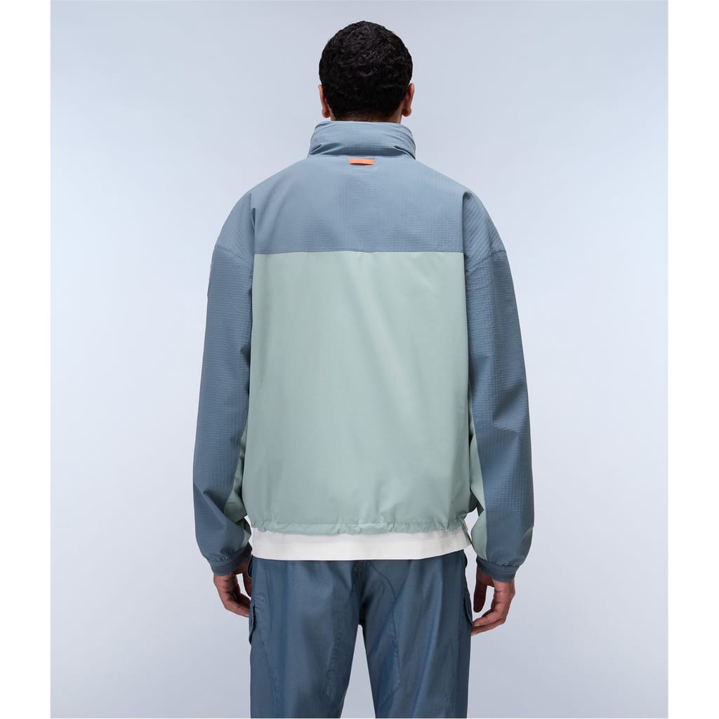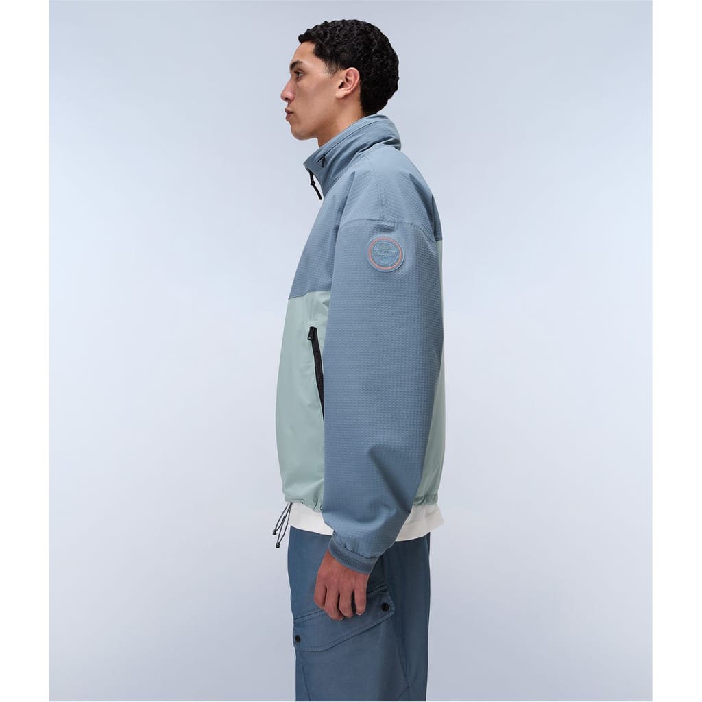 This Napapijri rain jacket features a high neck and a relaxed fit, offering both style and functionality. The short length and color block pattern add a modern touch, while the water-repellent attribute ensures protection against the elements. It includes a zipper closure and practical pockets, complemented by a subtle logo embellishment. -