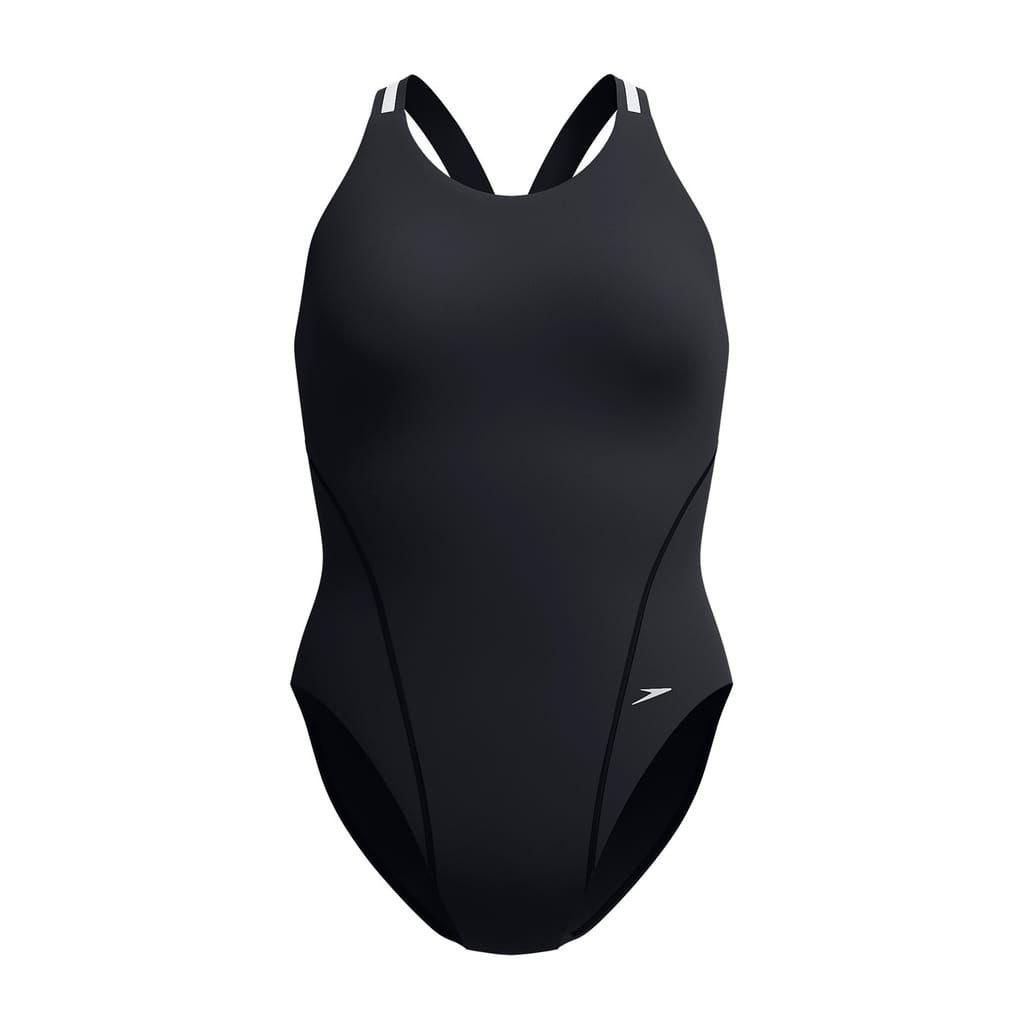 Discover the Speedo swimwear, a high-neck one-piece designed for optimal performance and style. This piece features a sleek design with a prominent logo embellishment, ensuring a distinctive look. Ideal for those seeking both functionality and a touch of brand flair in their swimwear collection. -