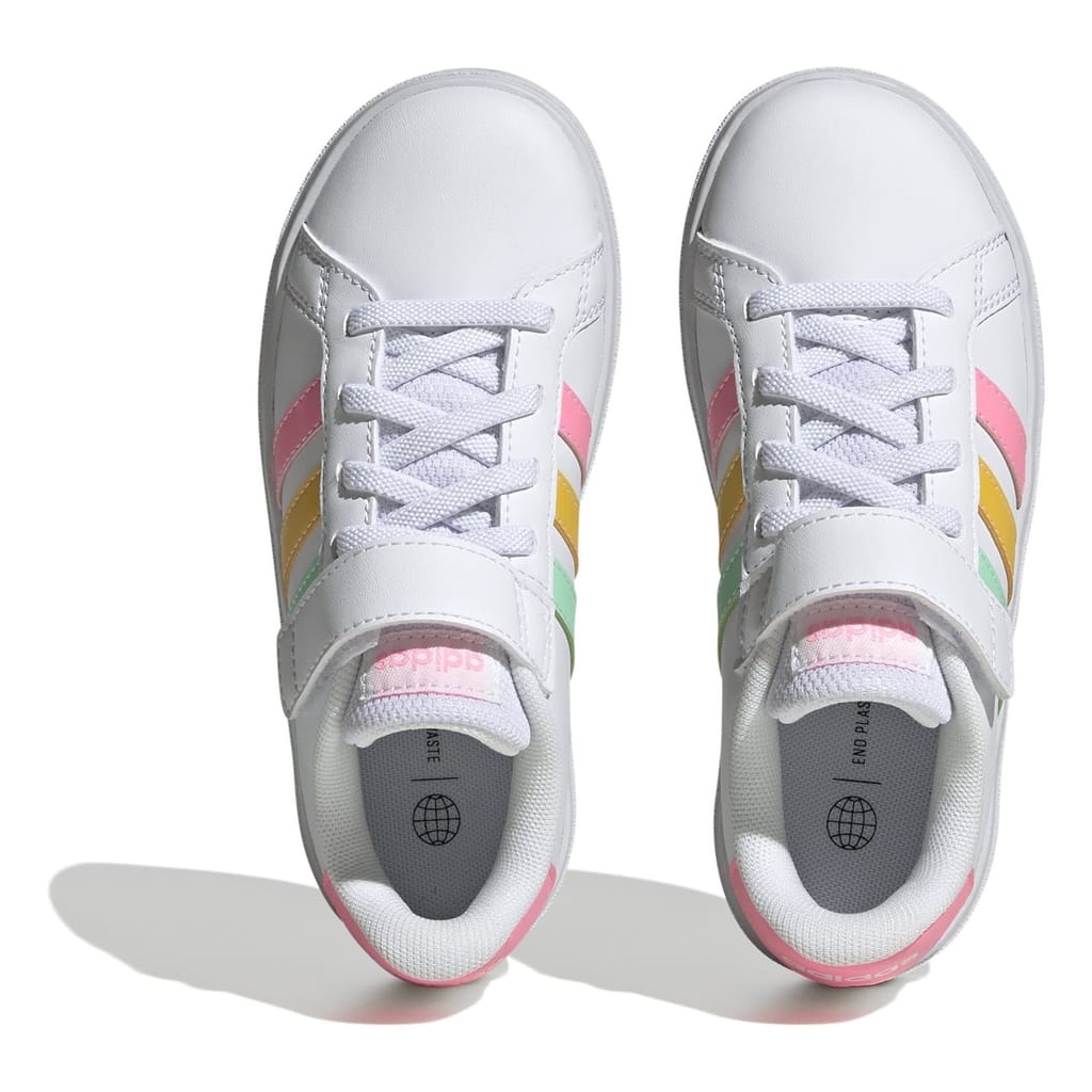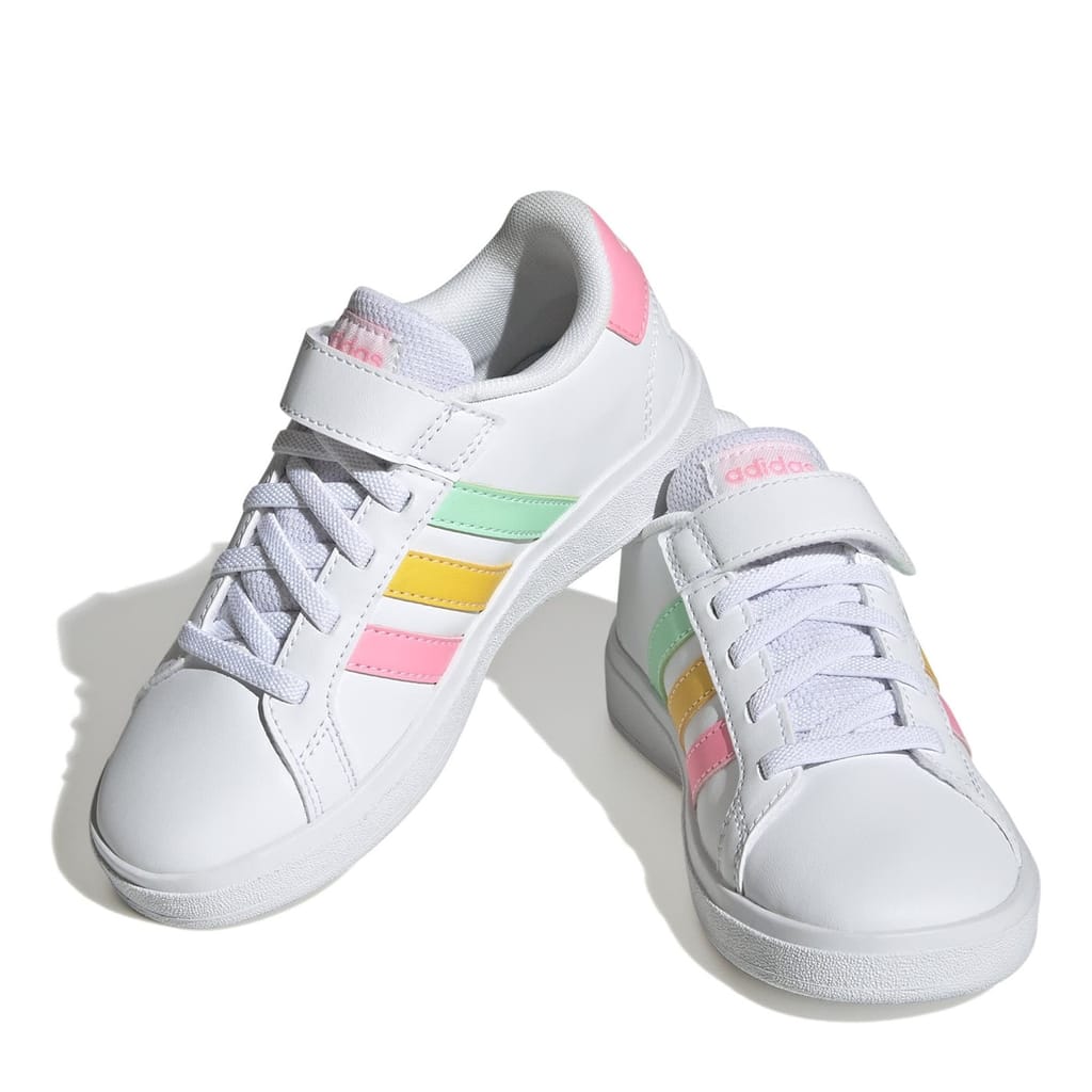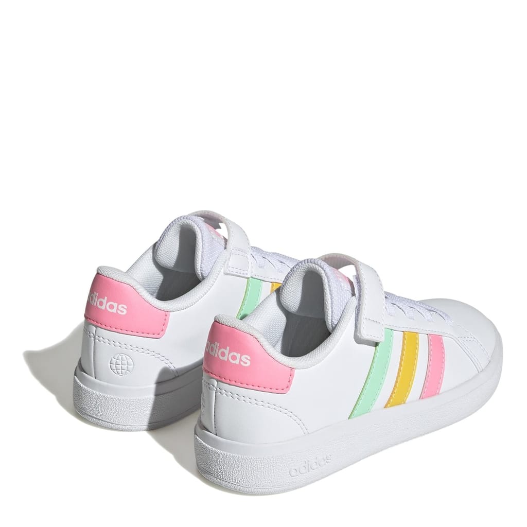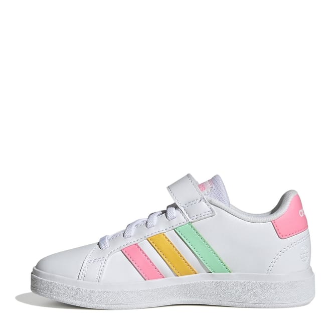 The adidas Grand Court Child Boys Trainers are a great addition to their weekend wardrobe, crafted with a low profile ankle collar, coupled with a lace closure, touch tape fastening strap and cushioning to the midsole and insole that provides all day comfort. Contrasting accents to the upper teamed with tonal stitching gives a simple but stylish look, finished off with the classic adidas three stripe branding to the side. -