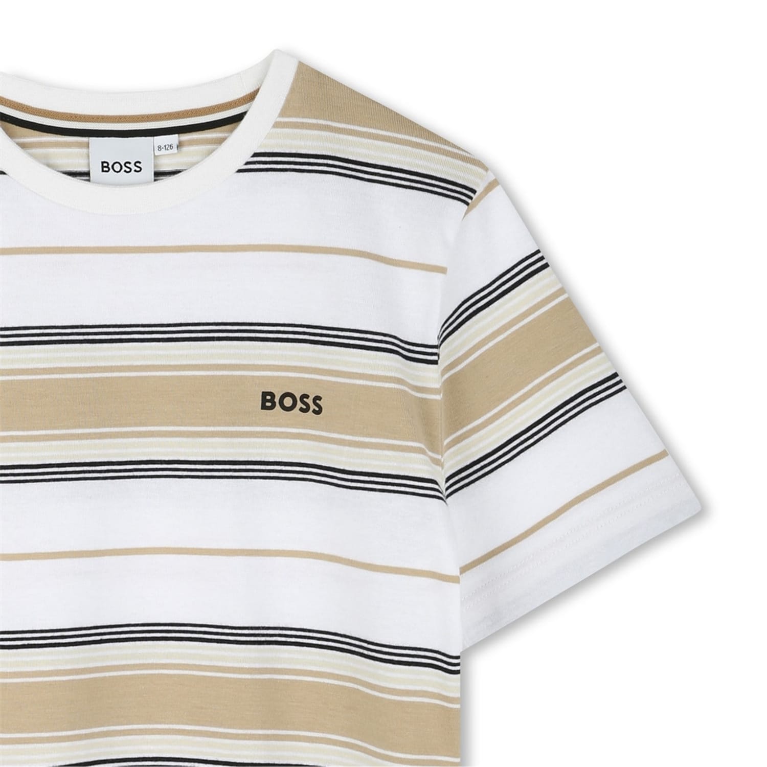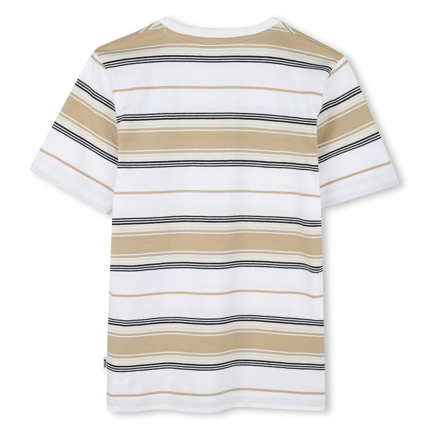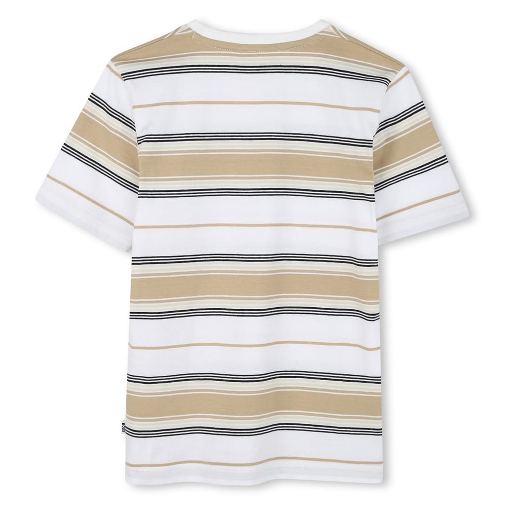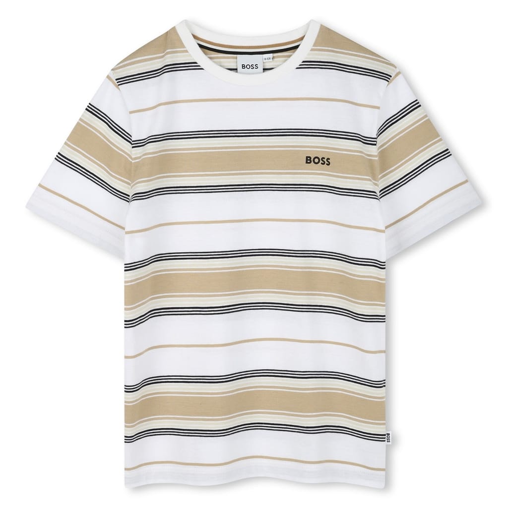 Elevate your casual wardrobe with this Boss t-shirt, a staple in the tops category. Designed in a classic regular fit, it features a stylish stripe pattern complemented by the iconic logo embellishment. The short sleeves and crew neck enhance its relaxed aesthetic, making it a versatile choice for everyday wear. -