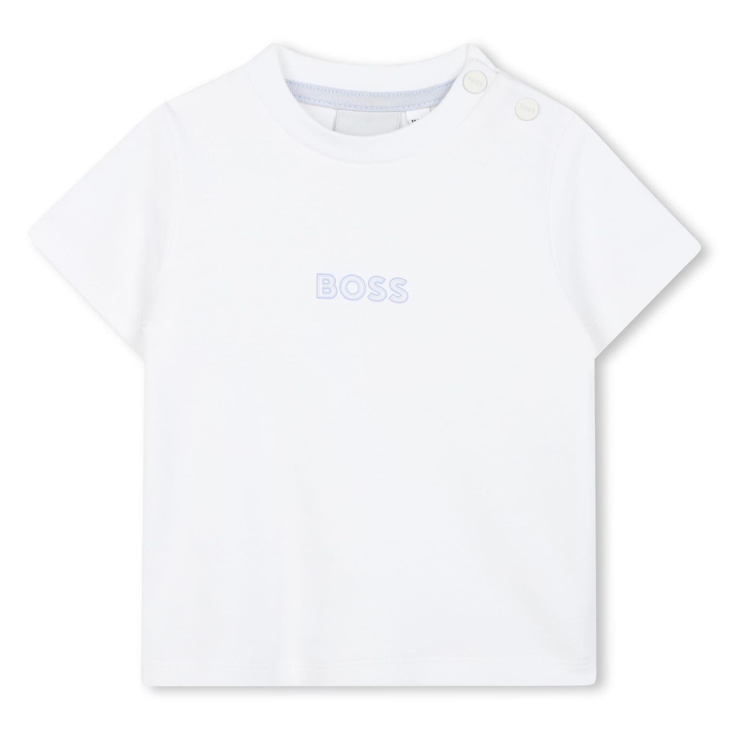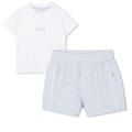 This Boss top short set for babies features a crew neck shirt with short plain sleeves, adorned with an all-over logo pattern. The set includes bermuda shorts, creating a stylish and comfortable casual look. The logo embellishment adds a touch of brand identity, making it a perfect choice for little ones. -