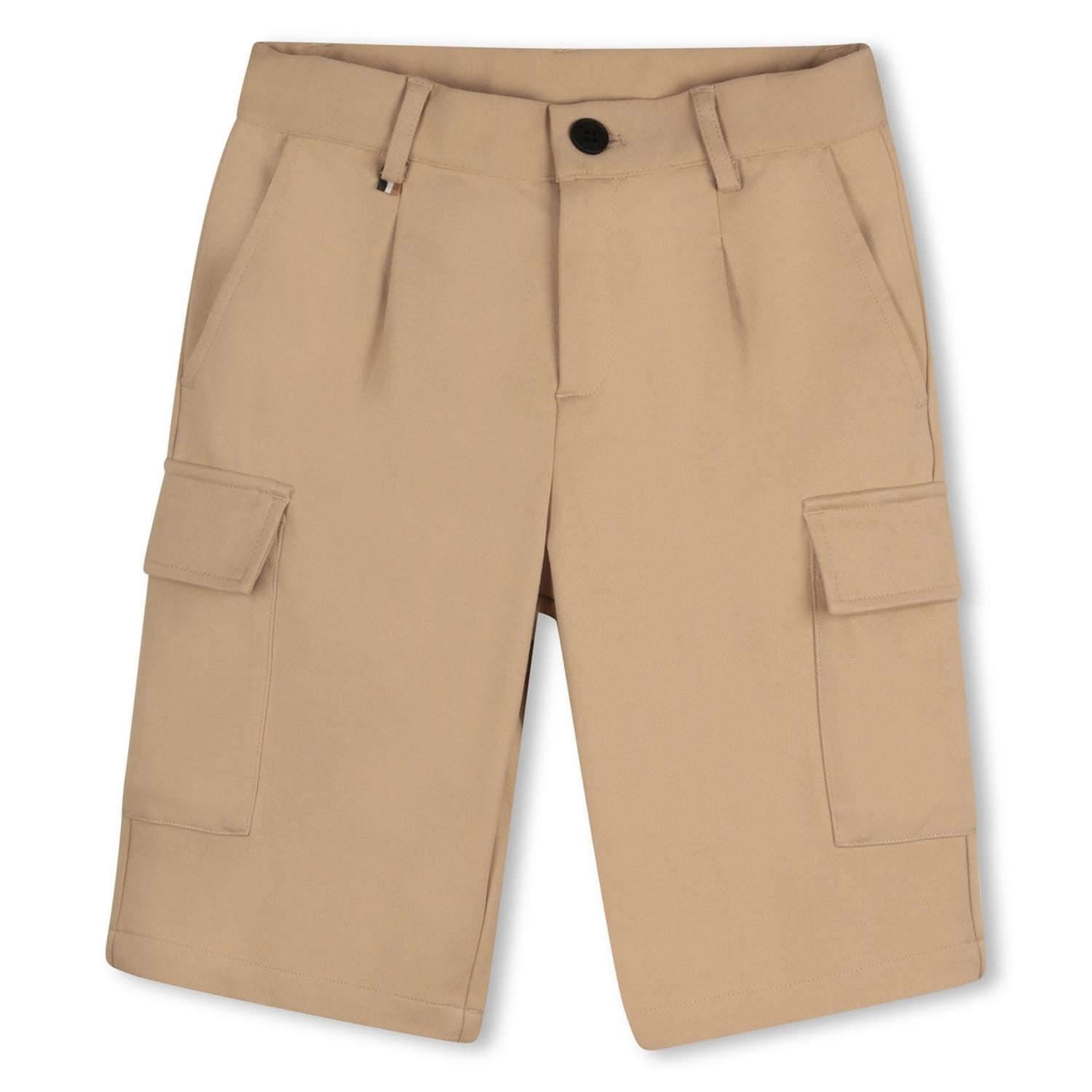 These junior cargo shorts from Boss are designed for a casual look. Featuring a solid pattern, they come with a button and zip fly closure for a secure fit. The shorts are embellished with practical pockets, making them both stylish and functional for everyday activities. -
