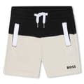 Elevate your casual wardrobe with Boss sweat shorts, featuring a stylish color block pattern. These shorts come with a convenient drawstring closure for a comfortable fit. The design is completed with a subtle logo embellishment, adding a touch of brand identity to your look. -