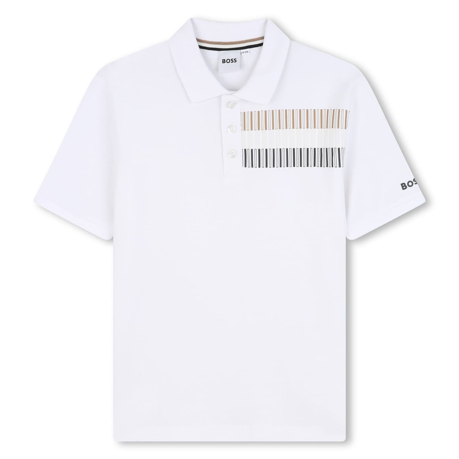 This Boss junior top is a casual staple featuring a stripe pattern and a polo collar. Designed with a regular fit, it includes a button closure and short sleeves. The top is adorned with a logo print, adding a touch of brand identity to the piece. -