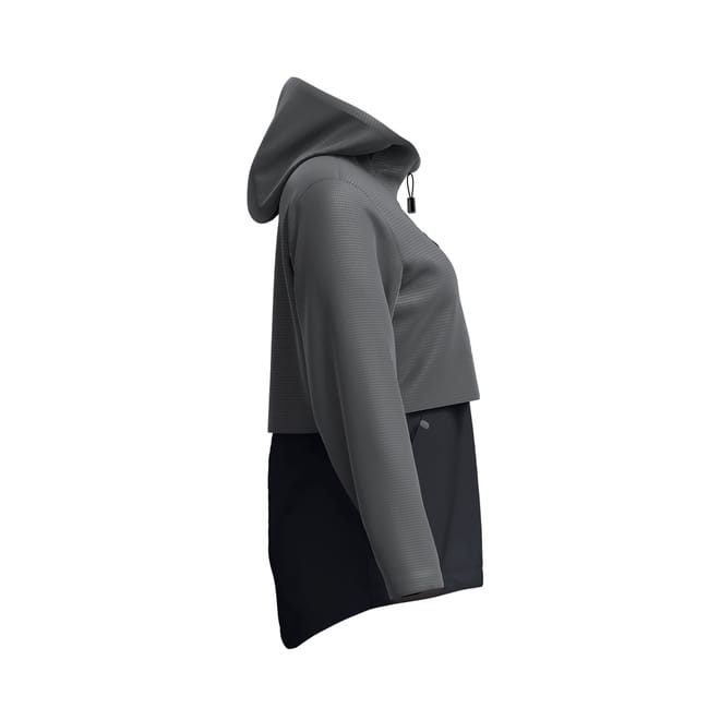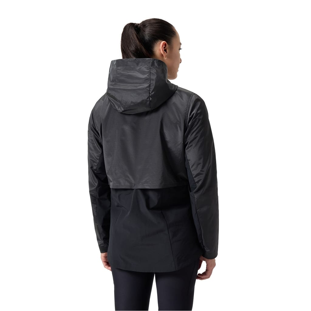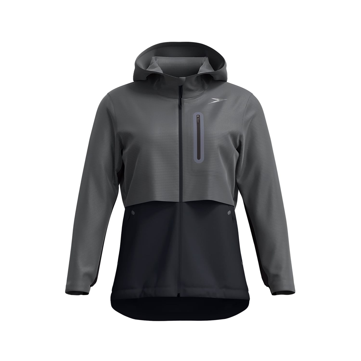 This Speedo running jacket from the activewear collection features a hooded neckline and a quarter zipper closure. Designed with a relaxed fit, it includes a solid pattern and a logo embellishment. The jacket also offers a zipped pocket for added convenience. -