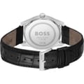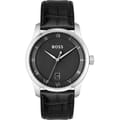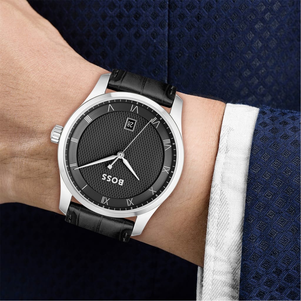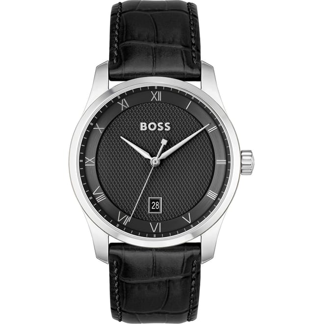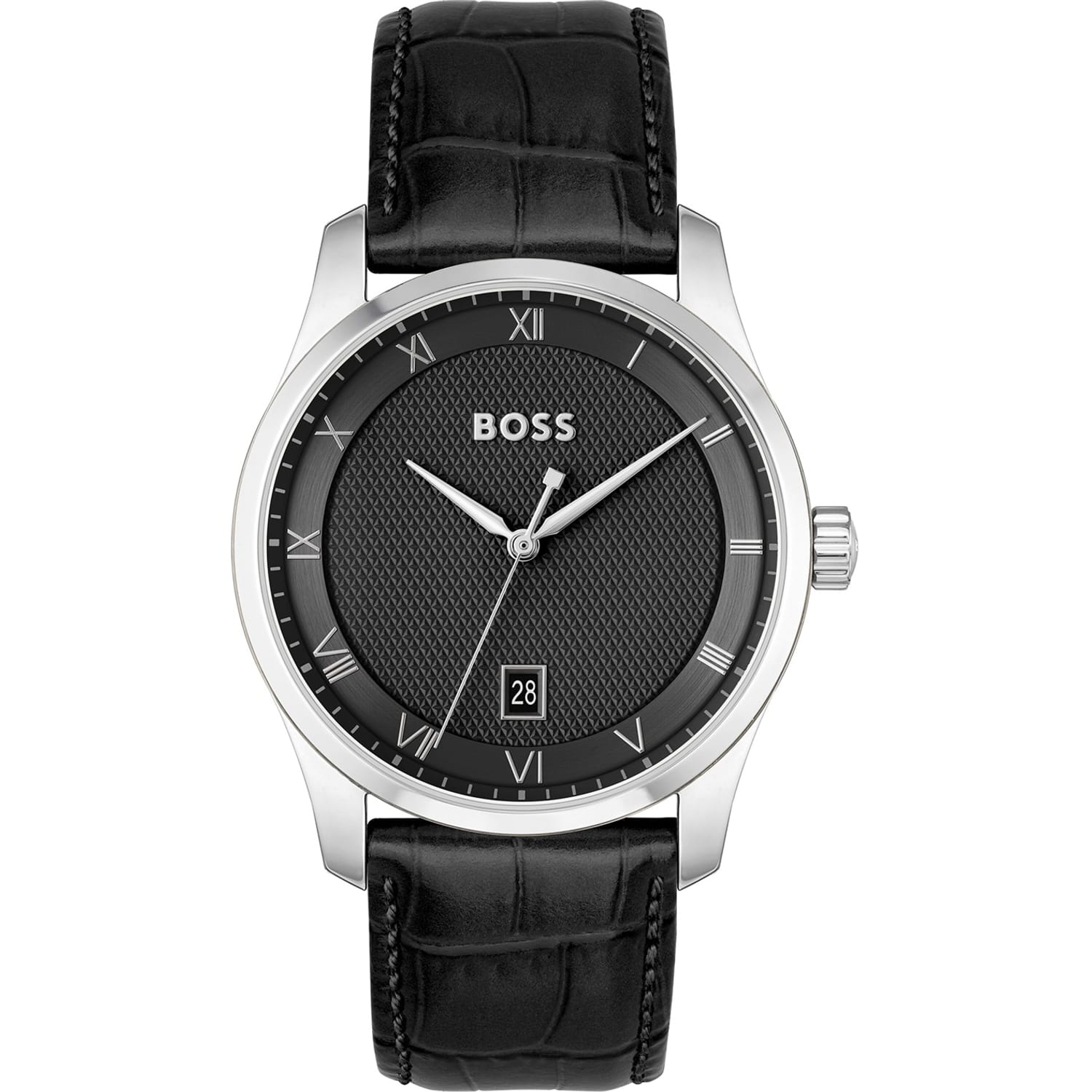 Large Roman numerals contrast with a modern textured dial in the refined BOSS Principle. This three-hand timepiece with date function features domed mineral glass over the watch face for a classic feel, while a stamped pattern at the center of the dial is balanced by a circular brushed outer ring. Designed with a stainless-steel case and available in: