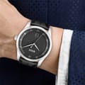 - A 41mm stainless steel case, black dial and black leather strap. Water resistant to 3ATM.