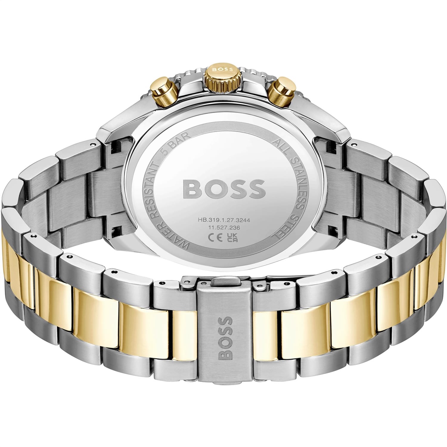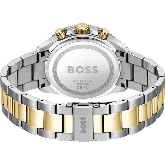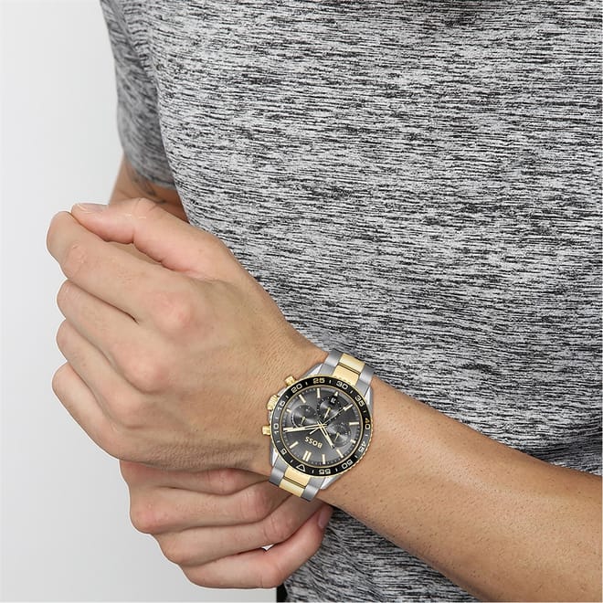A rotating bezel with an aluminum insert defines the BOSS Runner, a sporty Chronograph from BOSS Watches with a bold diver’s watch aesthetic. Functionality meets iconic branding in this elevated timepiece, which features hands and applied indexes with a highlighted fill, and three CD-cut sub-eyes on a circular brushed dial with reflector ring. Available in: