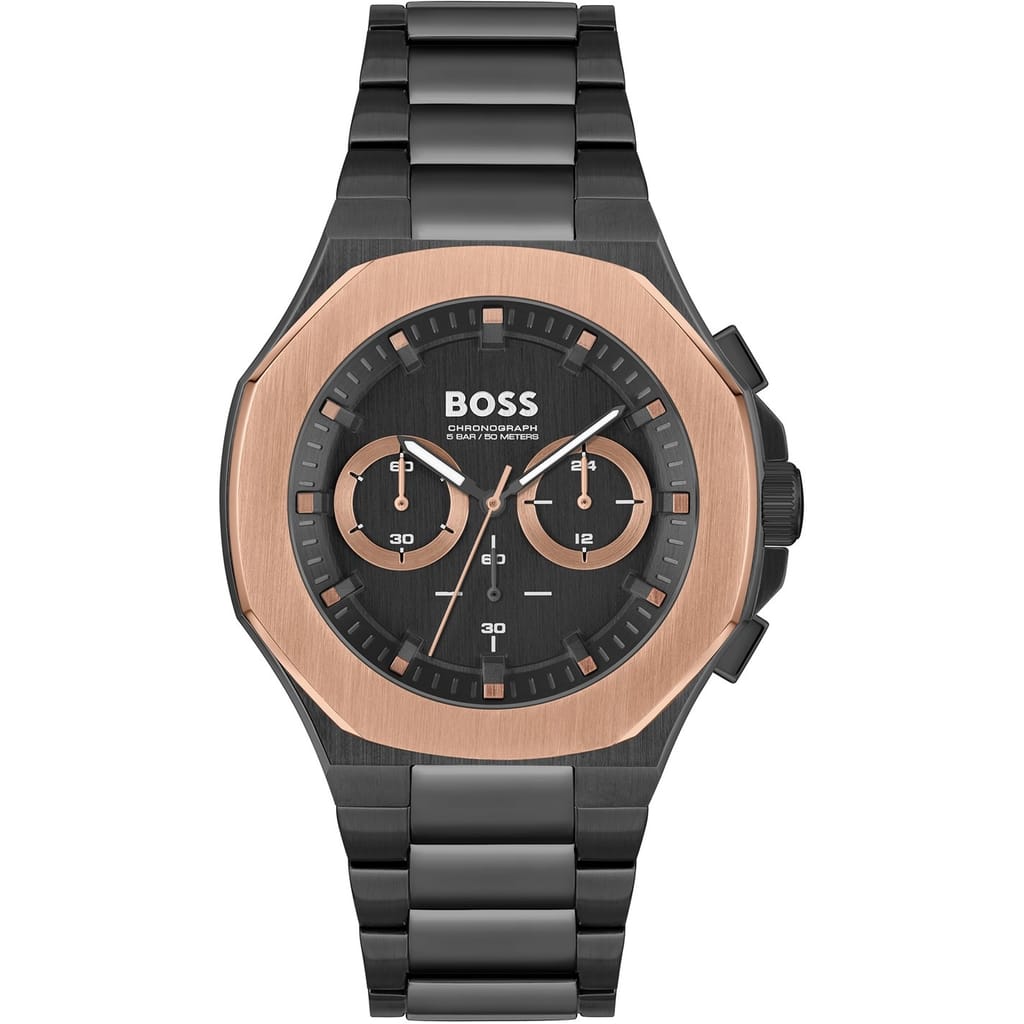 For the BOSS who leads where others follow, the trend-setting BOSS Taper is a natural choice. This chronograph with fully integrated case offers an innovative modern silhouette. The industrial-inspired design features a prominent shaped bezel, vertically brushed dial, and steeply angled metal reflector ring. Available in: