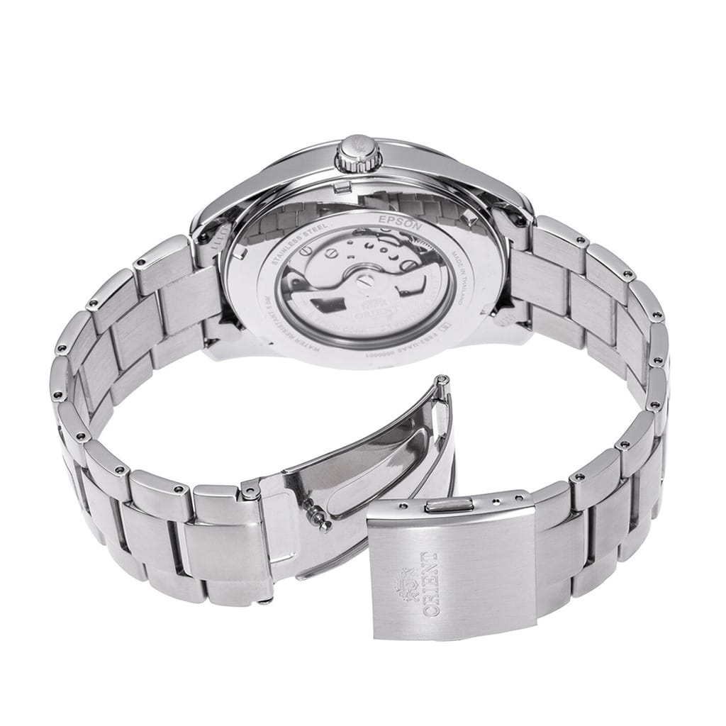 This stylish ORIENT Contemporary watch features a 41 x 11mm stainless steel case, a stunning green, red or light blue dial with an open heart aperture showcasing the intricate automatic movement inside, plus a sub seconds hand at 6 o'clock and gold or silver tone hands and hour markers. The watch is a nice blend of casual, style and comfort, with a steel bracelet completing the look. 50m water resistant. -