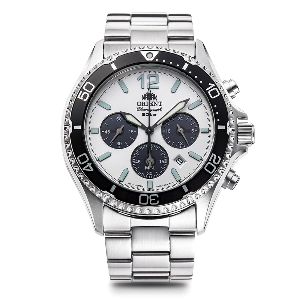 - The Orient Mako Chronograph Solar brings together dive and chronograph design elements, and is equipped with the convenience of solar-powered battery. This new model is powered by converting energy obtained from sunlight and other light sources into electrical energy, so there is no need to replace batteries. Charging is achieved through the three subdials; a 24-hour indicator at 3 o’clock, a 60-minute counter at 6 o’clock, and a small second subdial at 9 o’clock. The watch also features uni-directional rotating bezel while an Arabic numeral, inspired by the first Orient Mako model, adorns the 12 o’clock position. With a sapphire crystal and generous 200m water resistance, it is perfectly suited for a range of environments. -