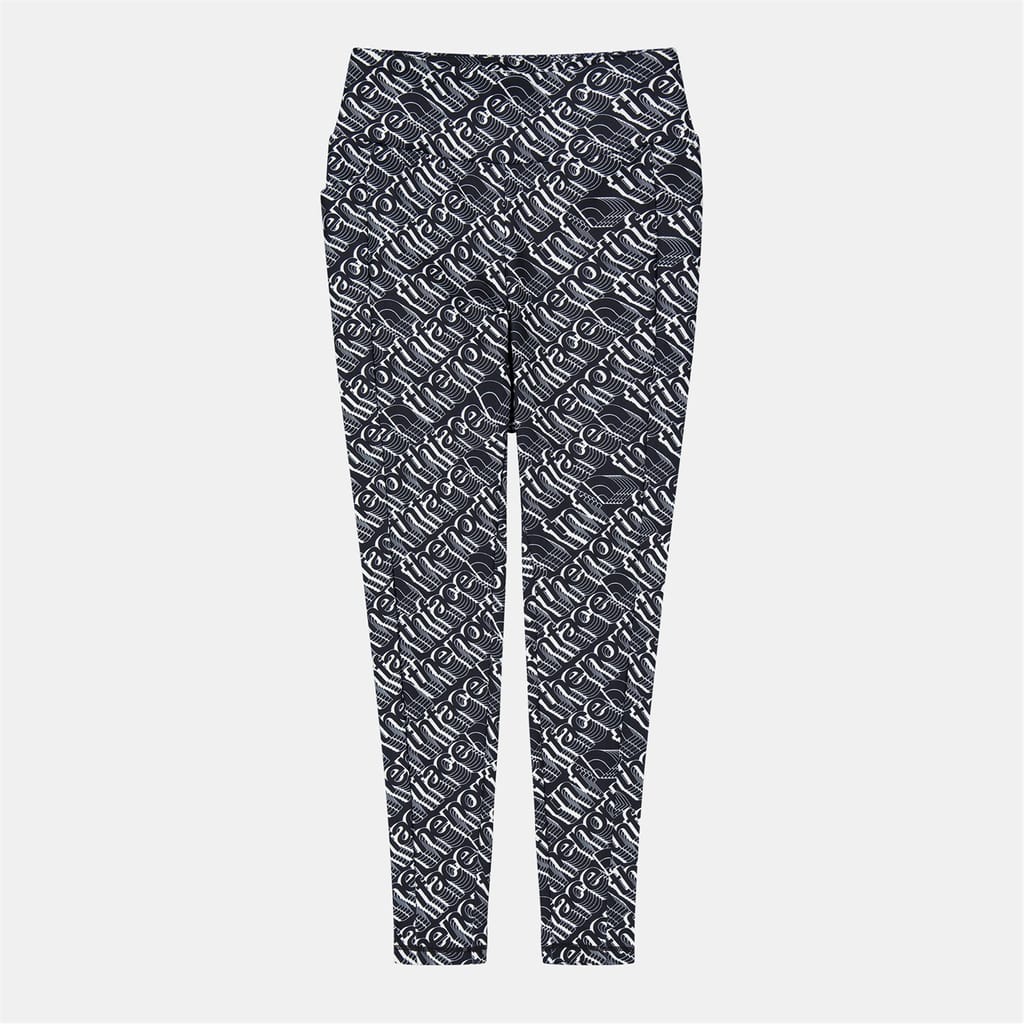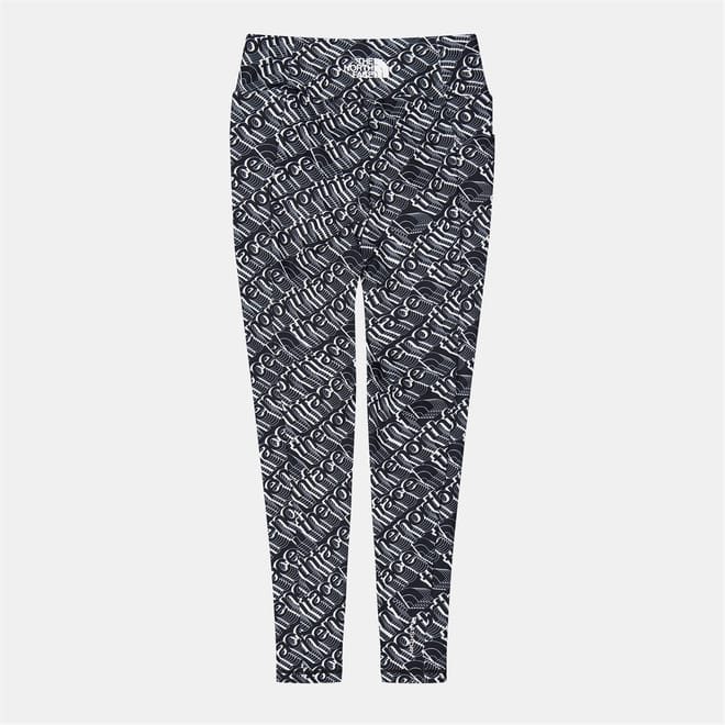 North Face leggings from the activewear collection feature an all-over logo pattern with distinctive lettering. These leggings are designed for comfort and style, showcasing the brand's iconic logo embellishment. -