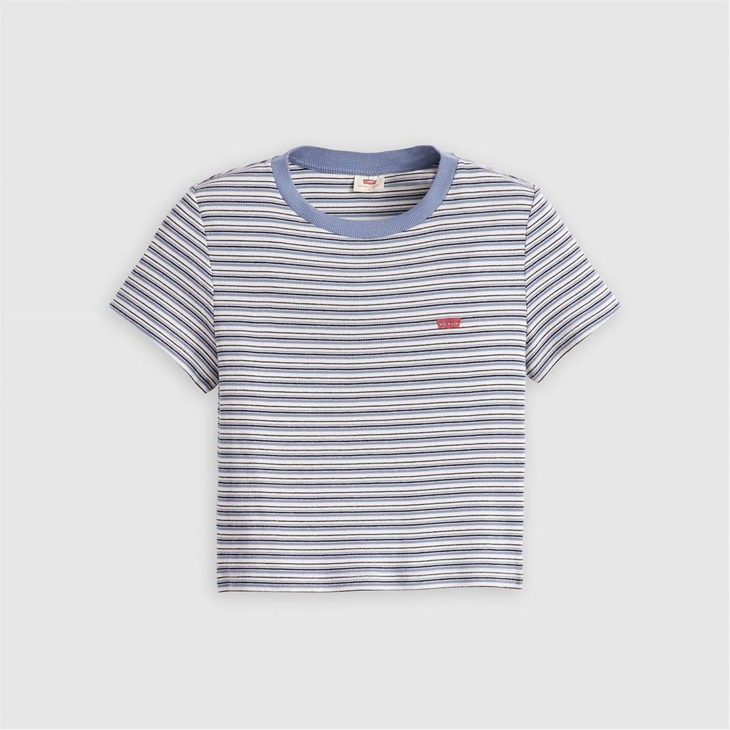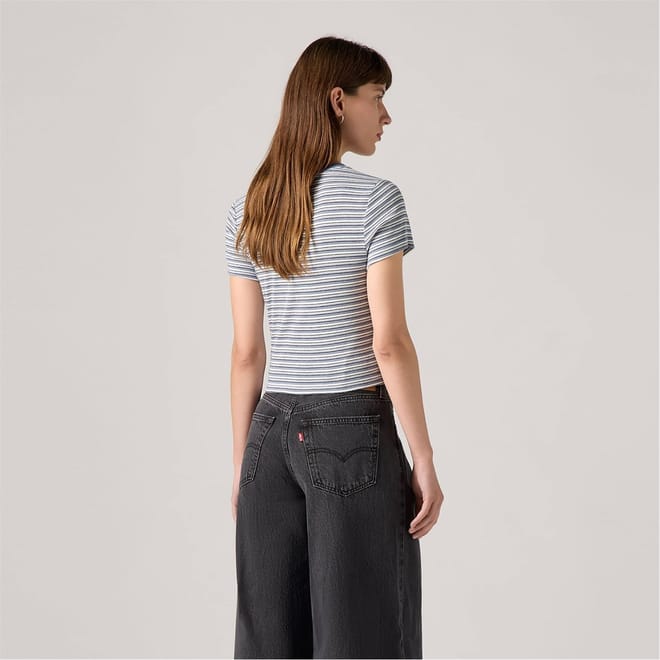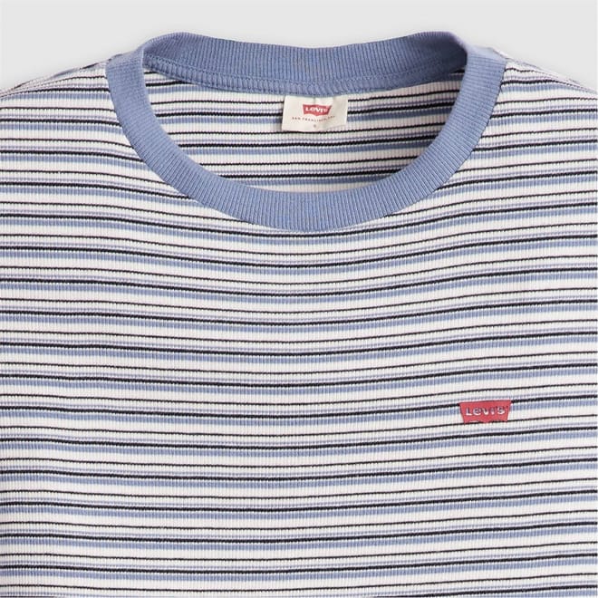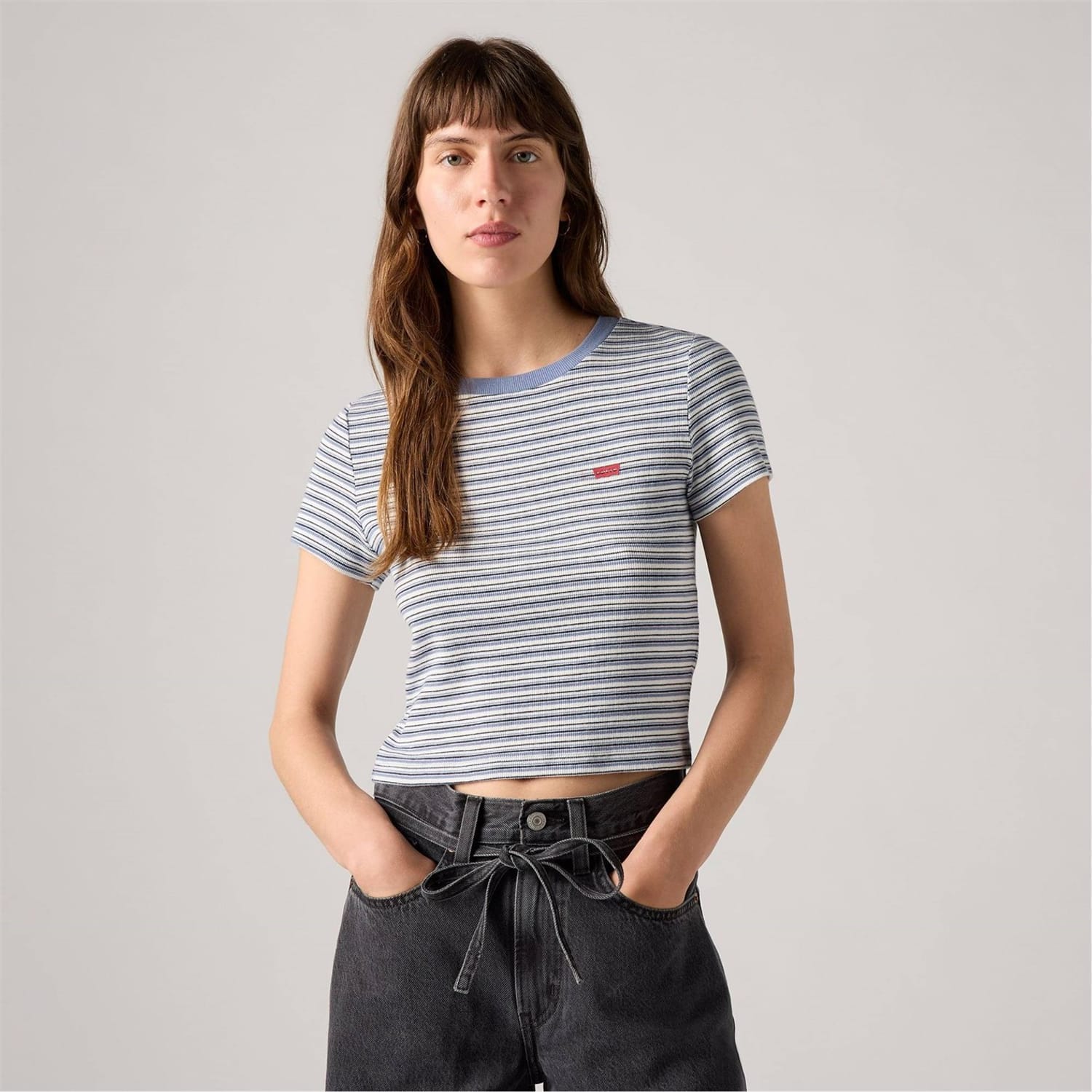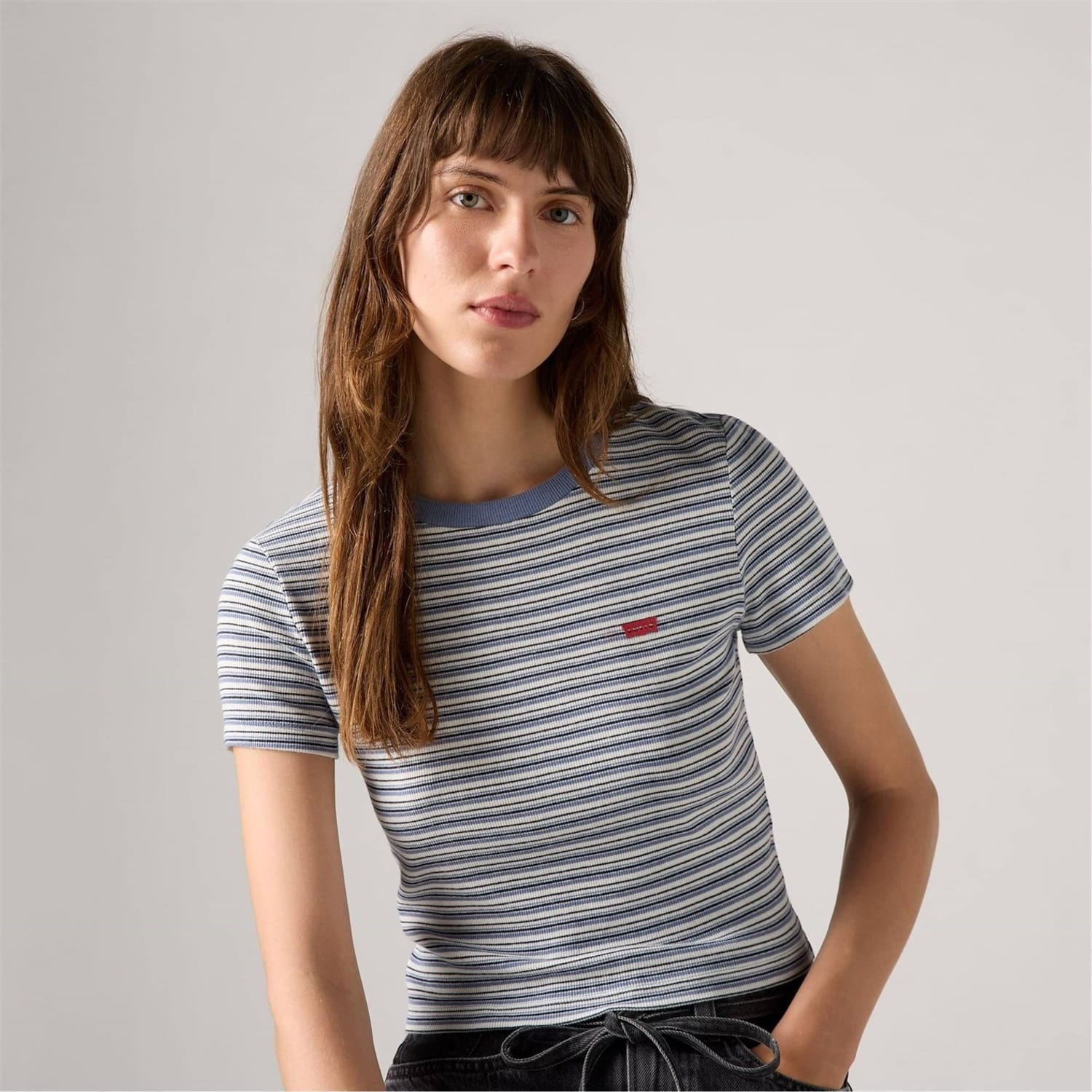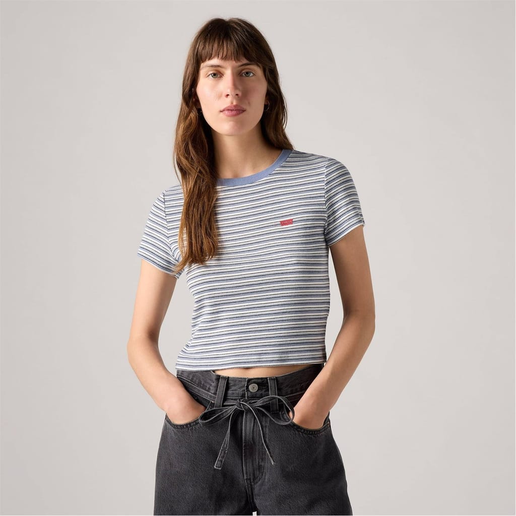 This Levi's cropped top is a versatile addition to your essentials collection. Featuring a crew neck and short sleeves, it offers a slim fit with a ribbed collar and cuffs. The striped pattern is complemented by an embroidered logo, adding a touch of style to your casual wardrobe. -