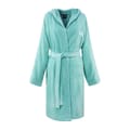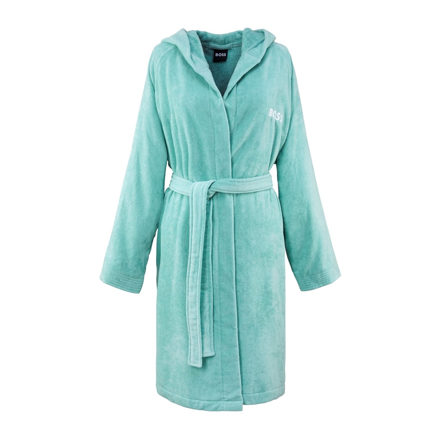 A stylish bath robe by Boss that alludes to the overall sportswear-inspired theme of the Plain collection with its hooded short design. Made with 100% velvet cotton, the material feels and looks luxuriously soft. The design is signed with a logo embroidery in a white stitch at the chest and is finished with a matching belt and side pockets. -