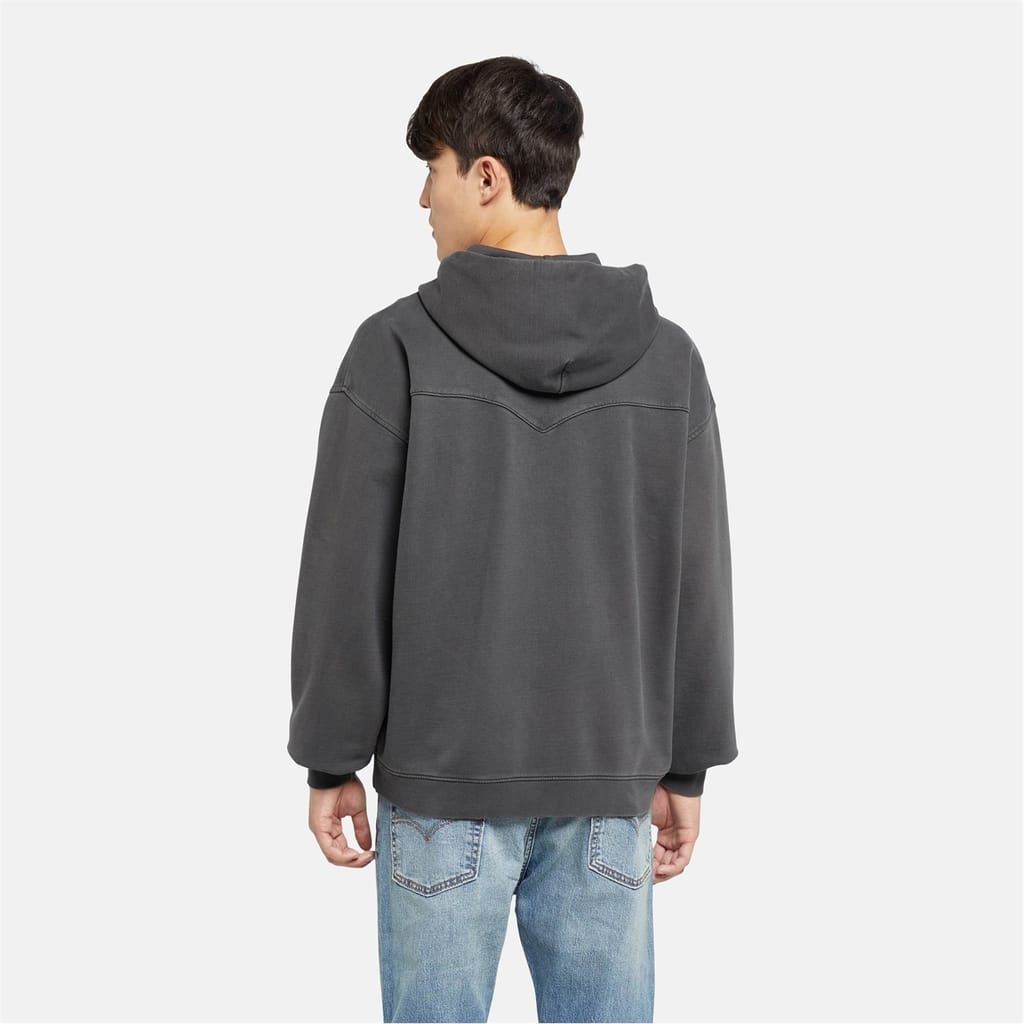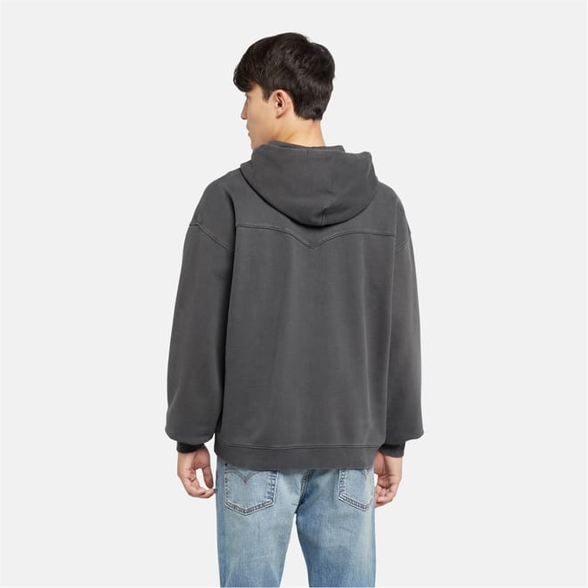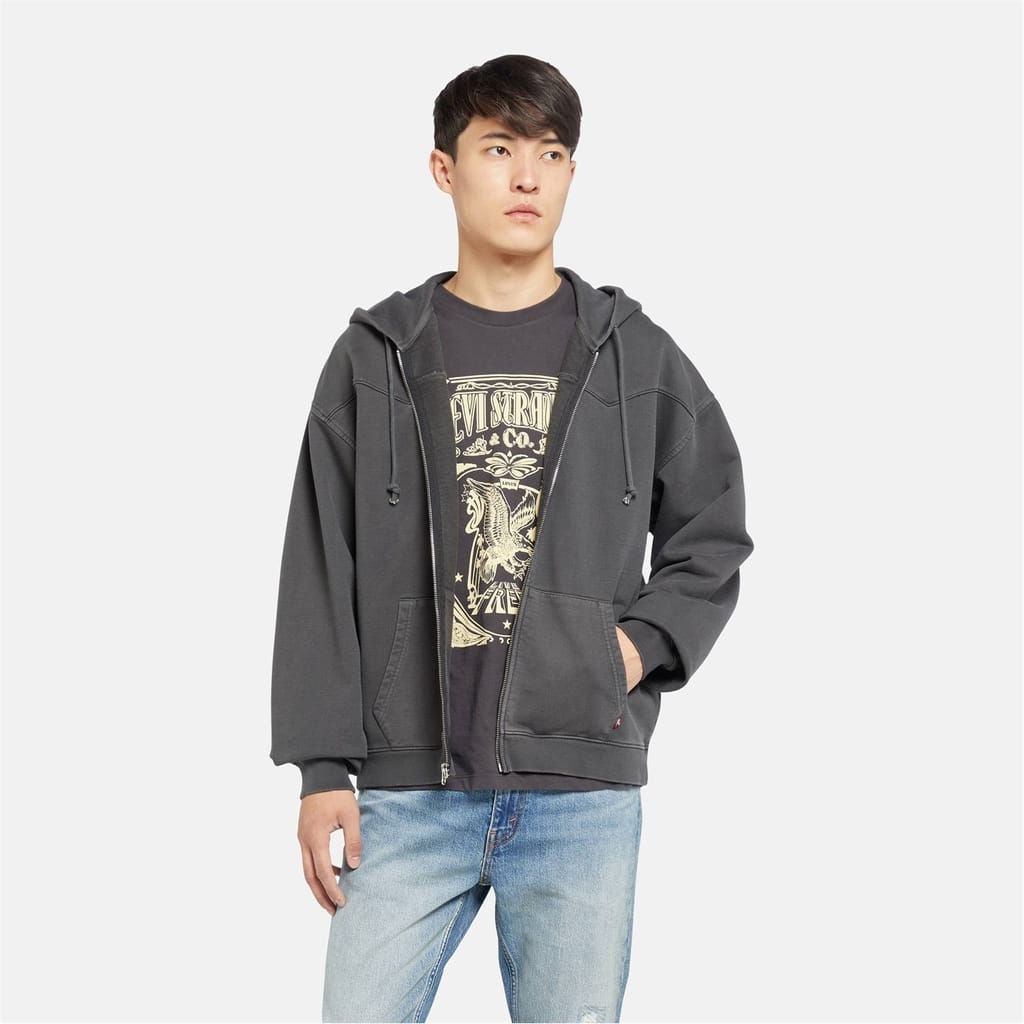 This Levi's sweatshirt jacket features a hooded design with a full zipper closure. It offers a relaxed fit with drop shoulder sleeves and a ribbed cuff. The solid pattern and straight hemline add to its classic appeal, while the pocket embellishments provide practicality. Ideal for those seeking comfort and style in a casual outerwear piece. -