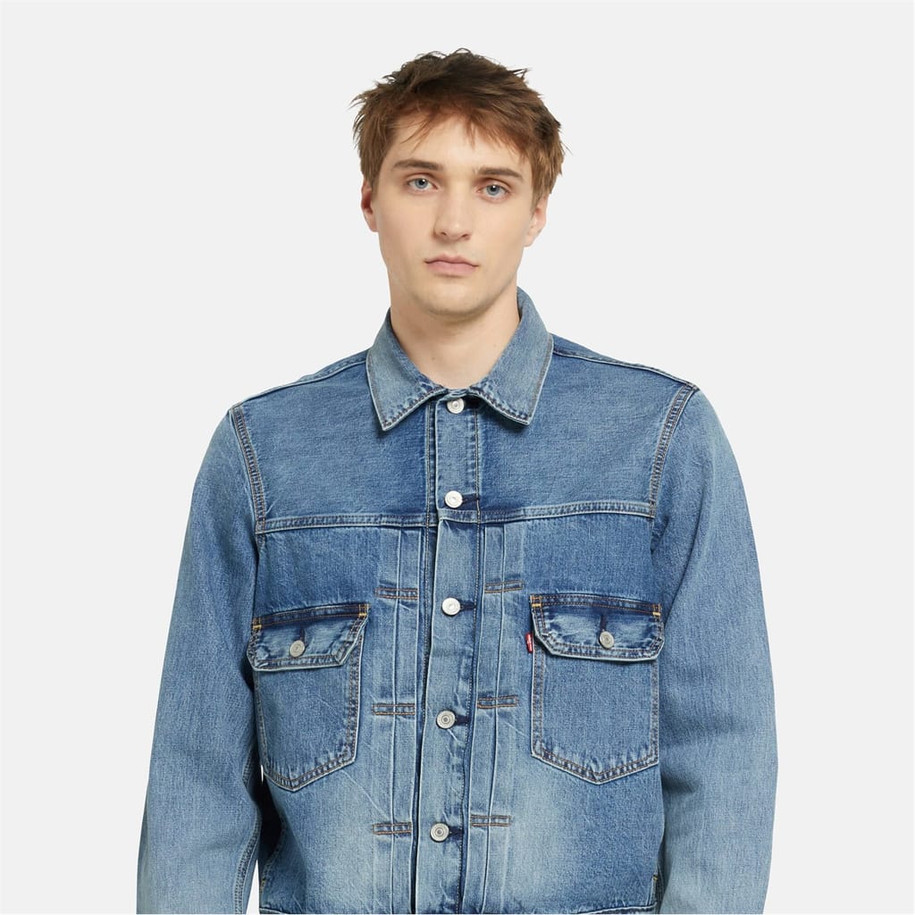 Levi's trucker jacket features a classic shirt collar and a button closure. This short, regular fit jacket is designed with a straight hem and solid pattern. It includes practical front pockets, adding functionality to its timeless style. -