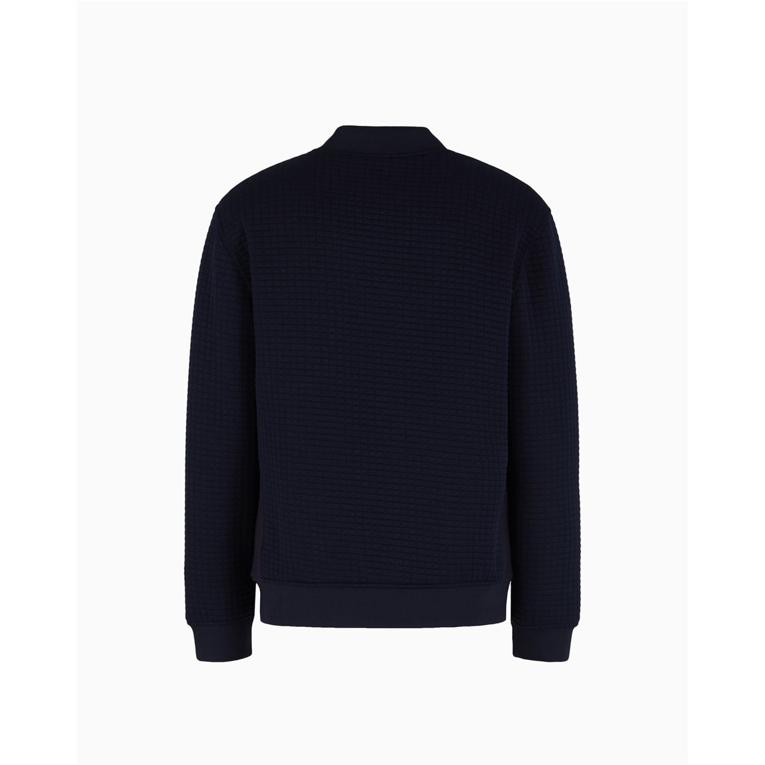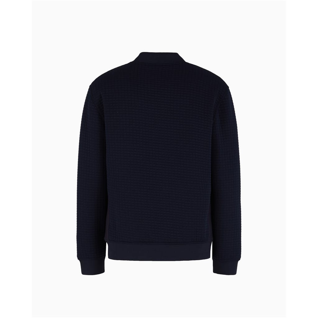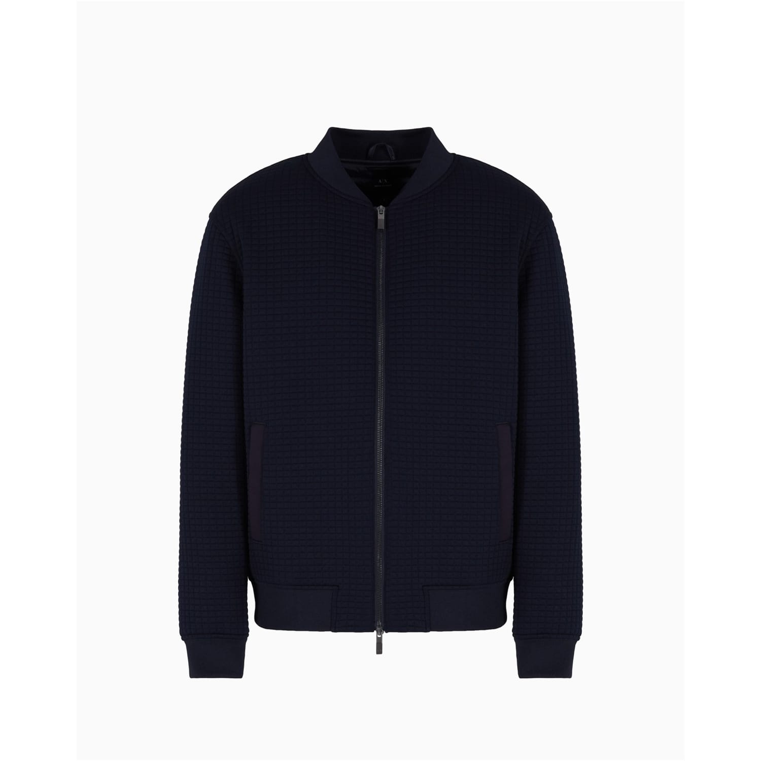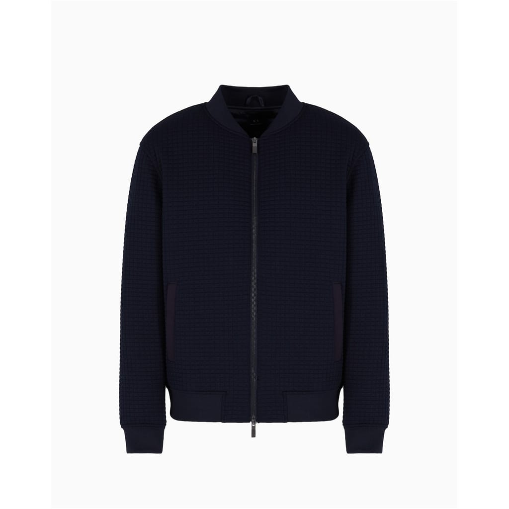 This Armani Exchange Harrington jacket features a textured pattern and a bomber collar. It has a full zipper closure and a ribbed hem for a classic look. The jacket is designed with a regular fit and includes practical pockets. The ribbed cuffs add a touch of style to this short-length jacket. -