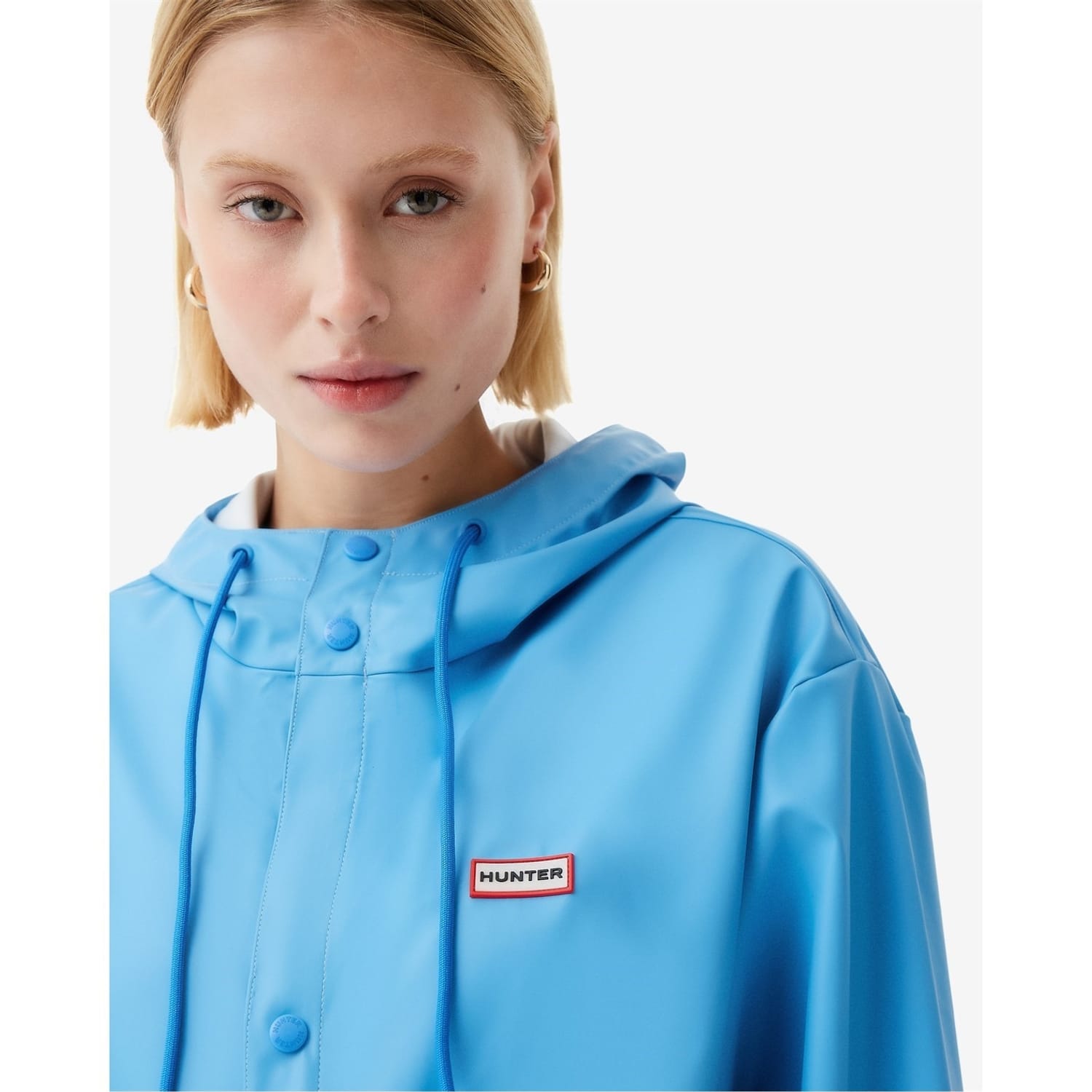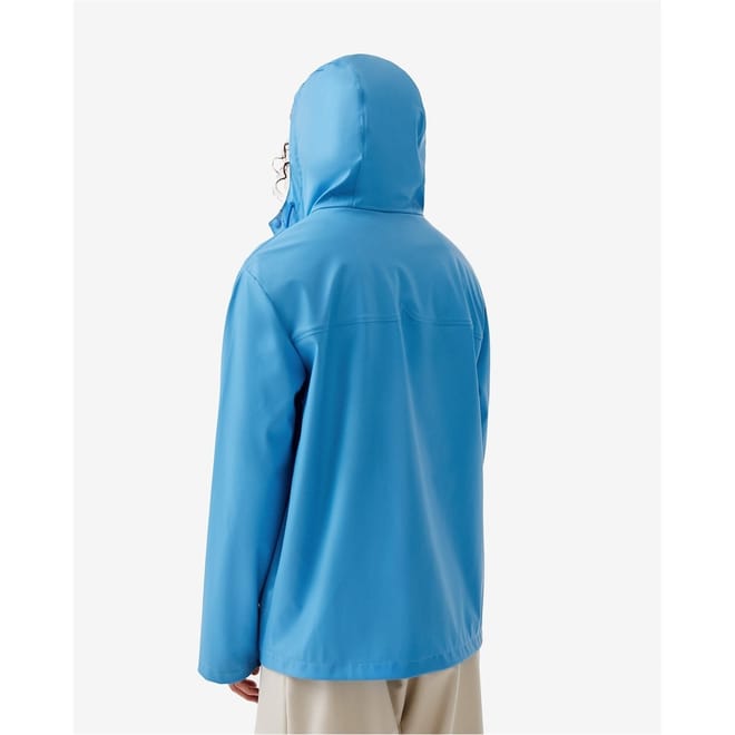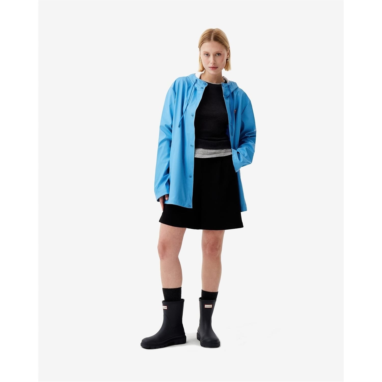This Hunter rain jacket is designed with a relaxed fit and features a solid pattern. It is water-repellent, ensuring protection against the elements. The jacket includes a snap button and zipper closure for secure fastening. Embellished with a logo and logo patch, it also has practical pockets. The short length and straight hem complete the design. -