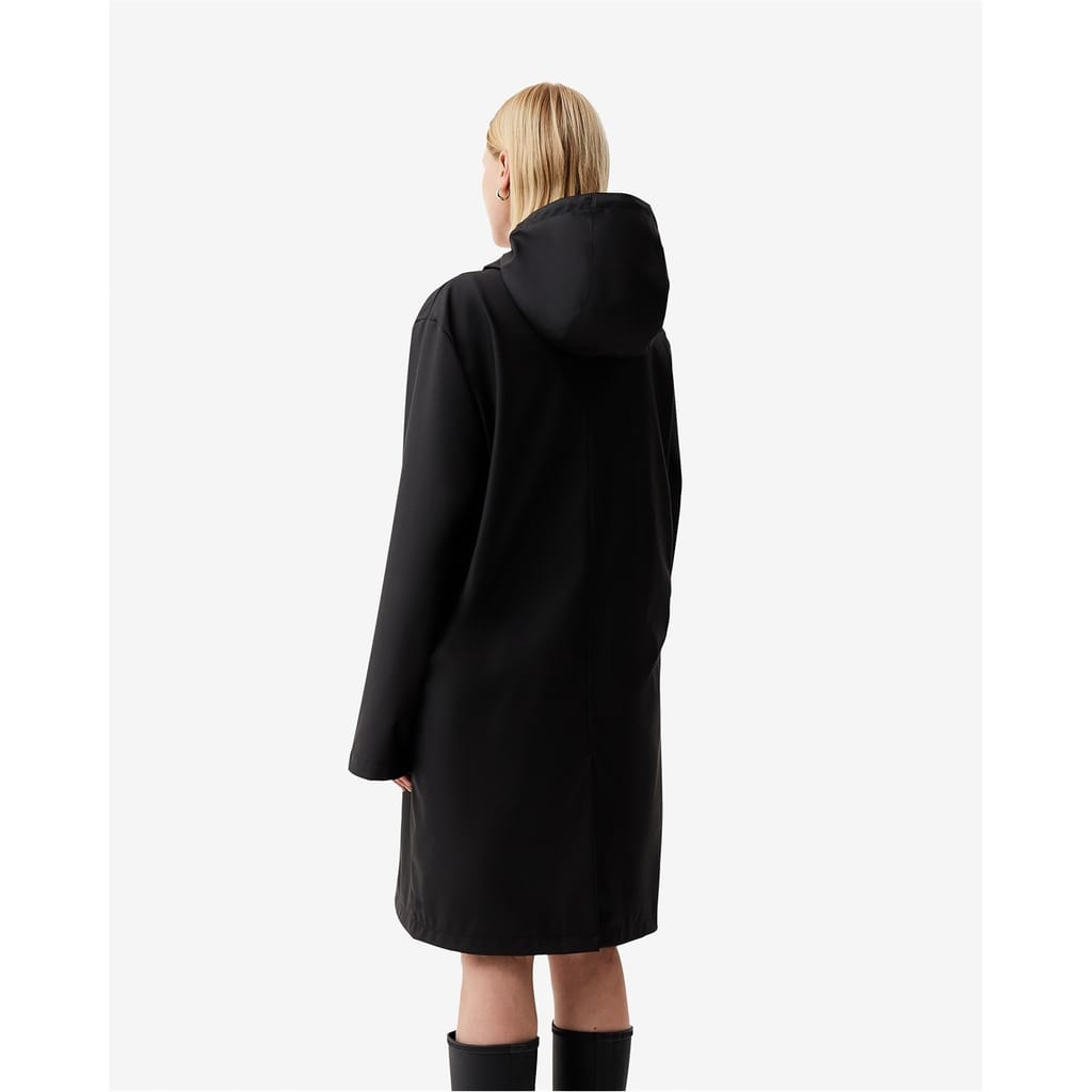 This Hunter rain jacket is designed with a hooded neckline and a relaxed fit, offering both style and functionality. The solid pattern and straight hem create a sleek look, while the water-repellent feature ensures protection against the elements. A zipper closure adds practicality, and the logo embellishment provides a subtle brand touch. -