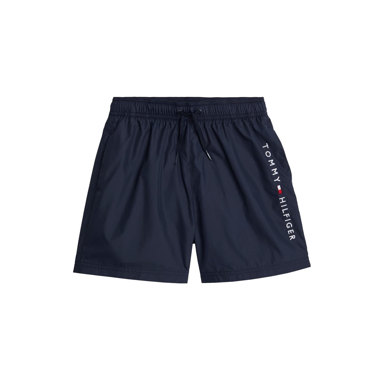 Tommy Hilfiger swimwear features a stylish swim bottom, perfect for swimming and beach activities. The design includes a drawstring closure for a secure fit, while the iconic logo embellishment and lettering graphic add a touch of brand identity. -