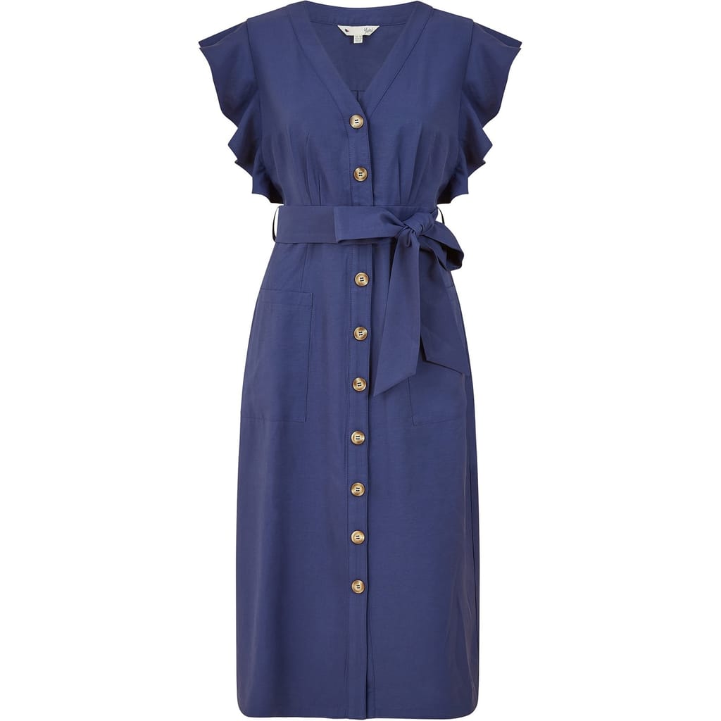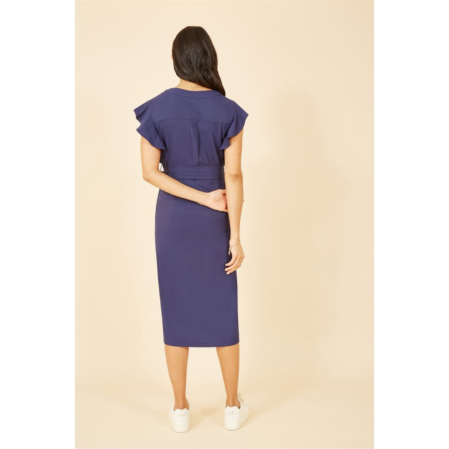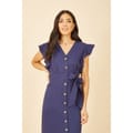 Made from lightweight navy fabric, this dress is perfect for work to weekend. The elevated feel of this midi shirt dress combines an elegant utility shirt dress cut, with statement dressing provided by the frill sleeve. With a button up front, pockets and an oversized self tie belt, the silhouette is timeless and flattering. -