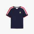 French Made Textured Piqué T-shirt Textured organic cotton piqué fabric Slim fit Contrast stripe mesh panels on shoulders and sleeves Heritage badge embroidered on chest Sewn-on embroidered crocodile on chest