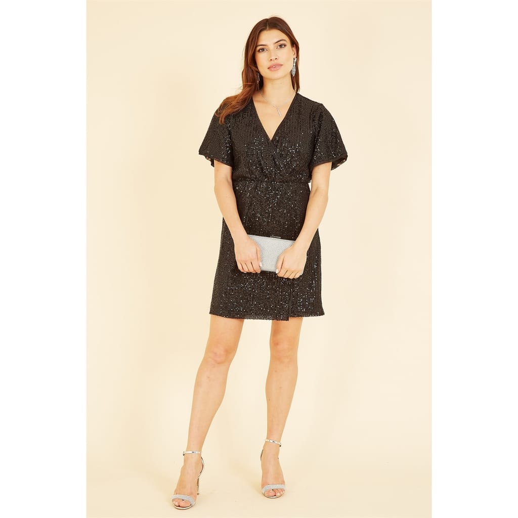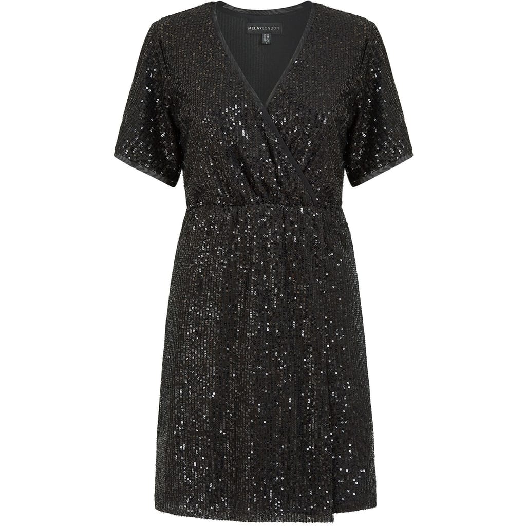 Sparkle your way through party season in this stunning Mela Black Sequin Kimono Sleeve Wrap Dress. Crafted to be extra flattering, with loose short sleeves, a fitted waist and kimono style v-neck wrap top. Covered entirely in black sequins - because why do sparkle by halves? Pair with strappy heels, or tights and closed-toe wedges. -