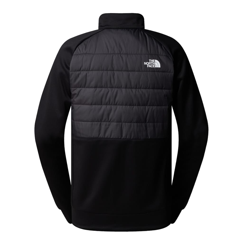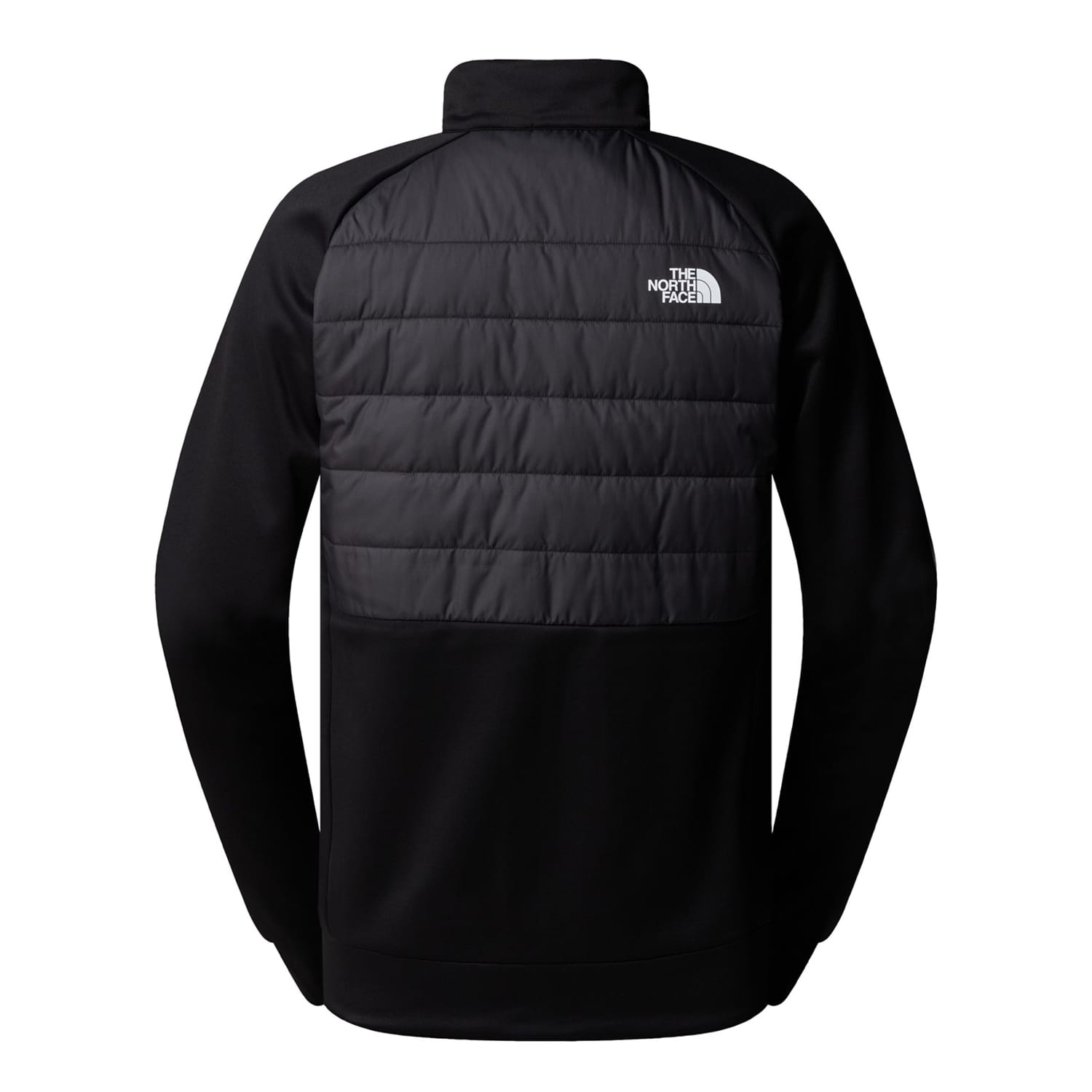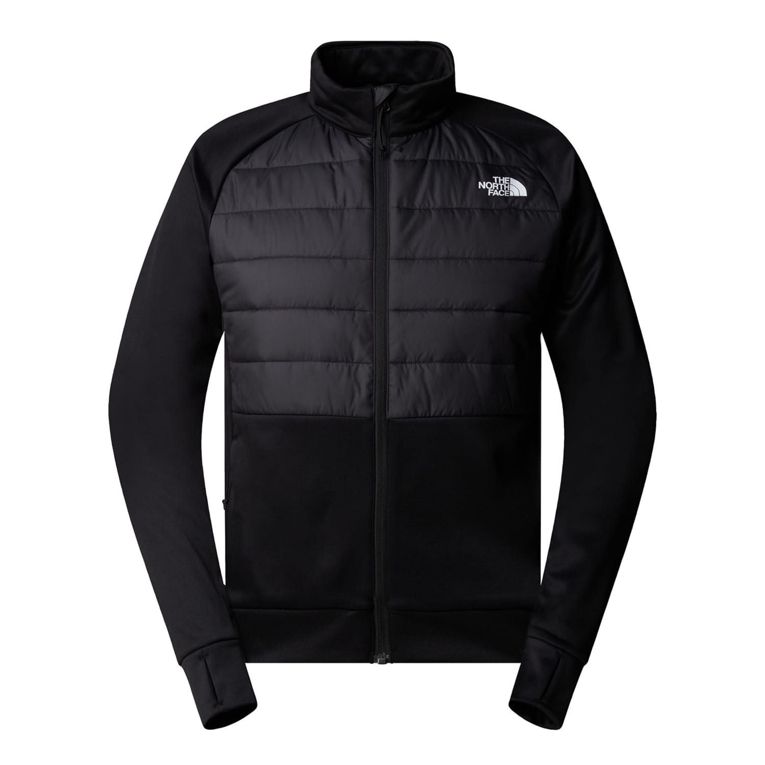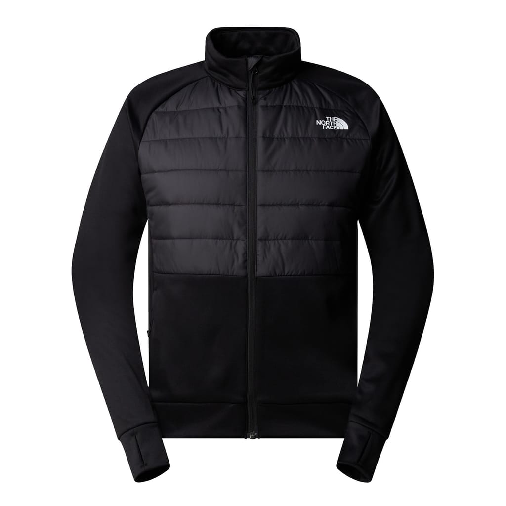 The North Face hybrid jacket features a high collar and a regular fit, offering a solid pattern with a straight hem. It includes a zipper closure and ribbed cuffs for added comfort. The jacket is adorned with a logo, showcasing its brand identity. -