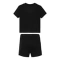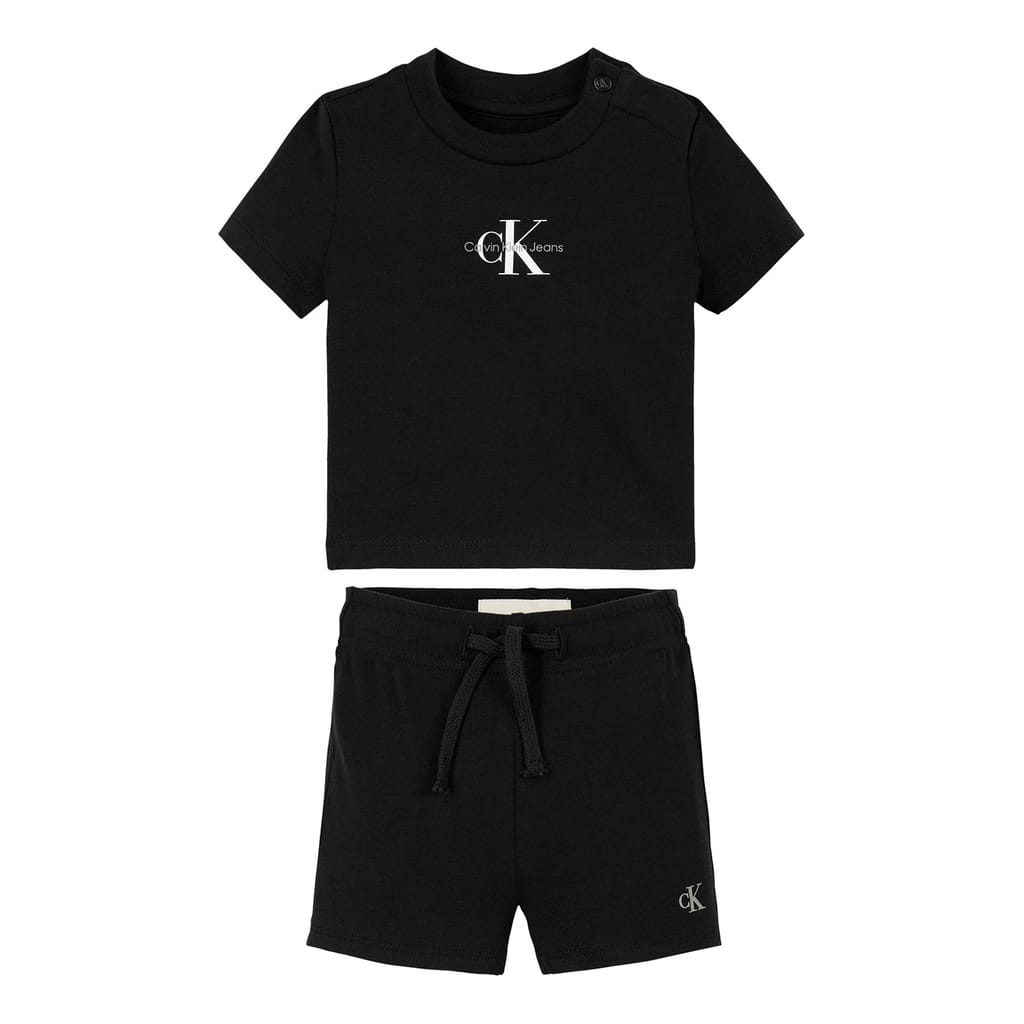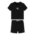 This Calvin Klein Jeans top short set features a casual Bermuda shorts style, perfect for relaxed outings. The top boasts a crew neck and plain short sleeves, adorned with a distinctive logo print and lettering graphic. The set is completed with a logo embellishment, adding a touch of brand identity to the ensemble. -