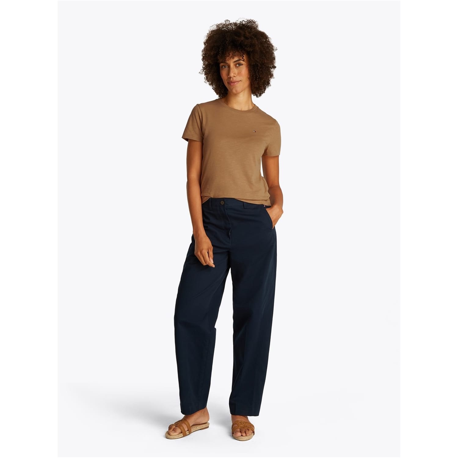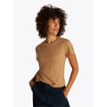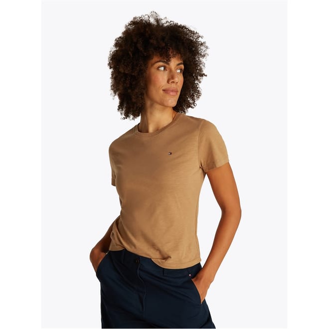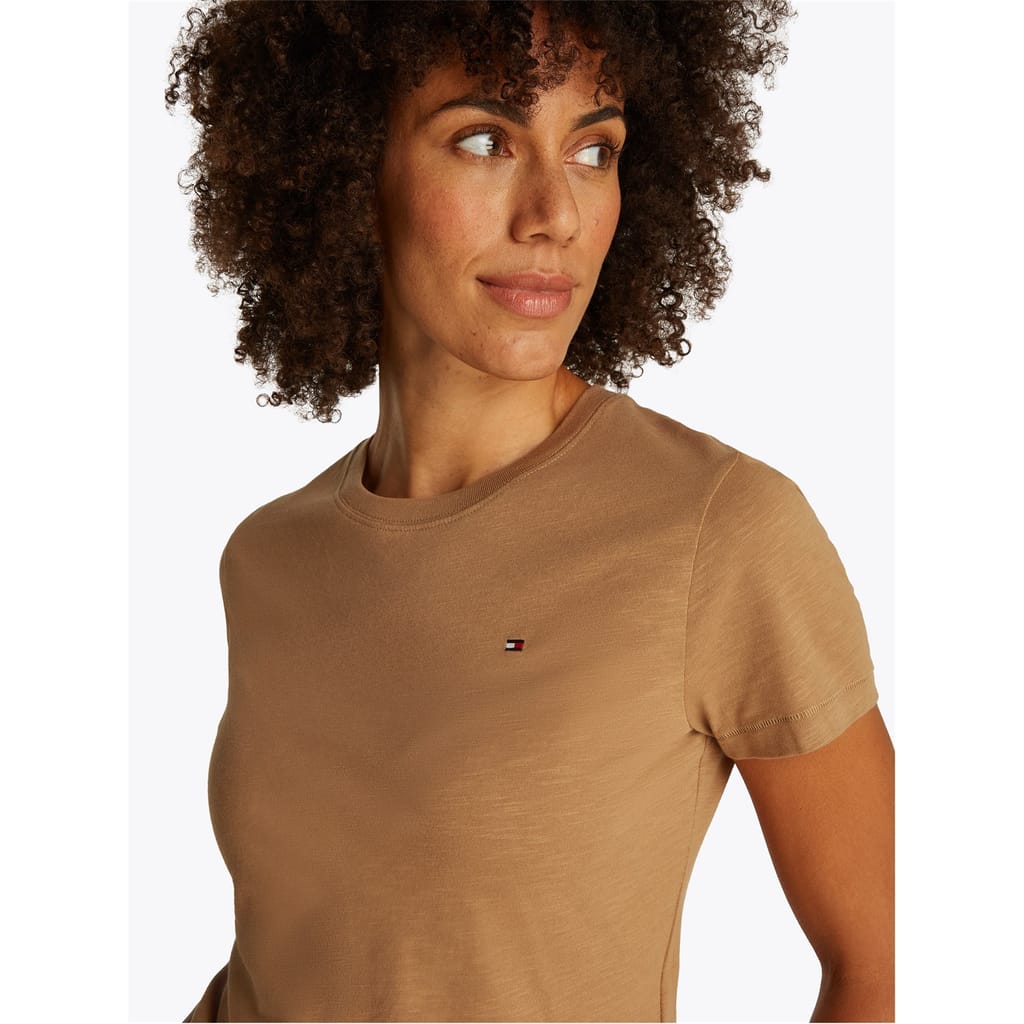 This Tommy Hilfiger top features a classic crew neck and short sleeves, offering a regular fit. The solid pattern is complemented by a subtle logo embellishment, adding a touch of brand identity. -