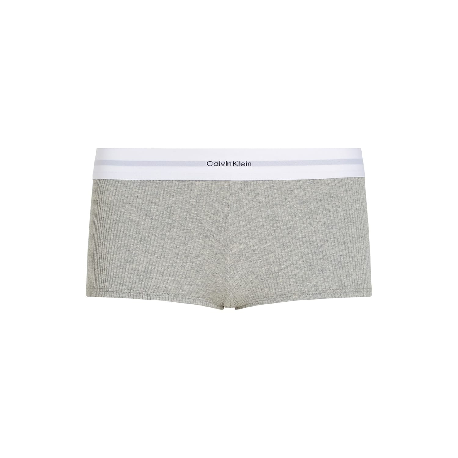 Calvin Klein boxer underwear features a boy short style with a ribbed pattern. The plain design is complemented by a subtle logo embellishment, making it a versatile choice for everyday wear. -