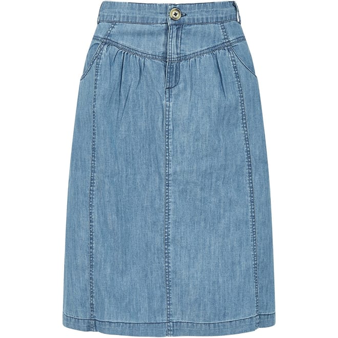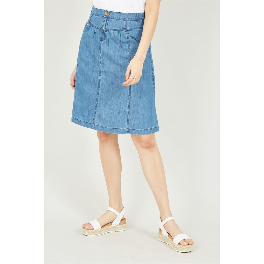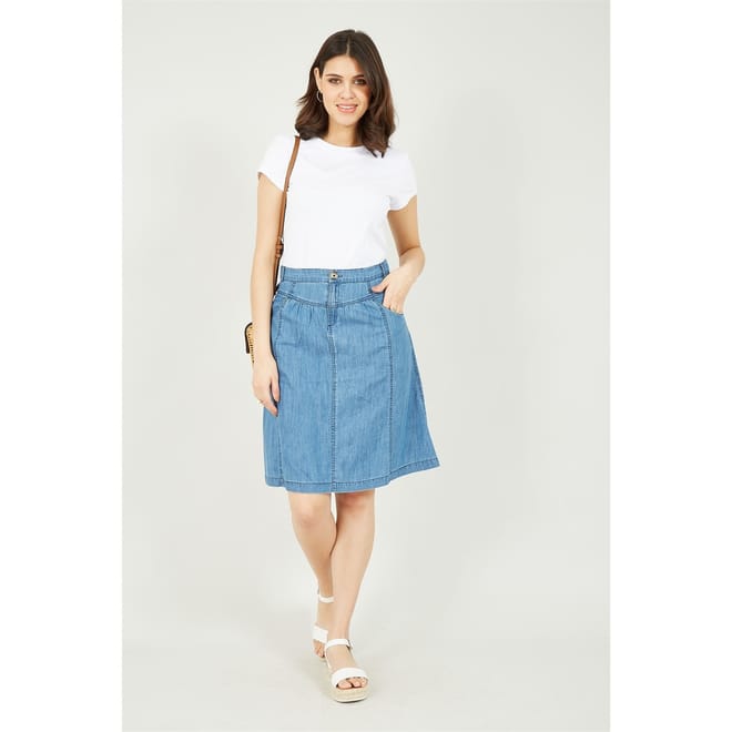 This Yumi Blue Chambray Skirt is a summer essential. This A-line skirt features 100% cotton for the all-important essential comfort, finished with a button to ensure a perfect fit. This relaxed silhouette is perfect for your casual occasions. -