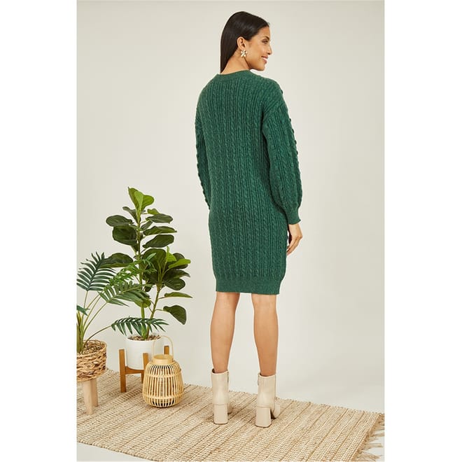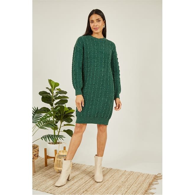 Cosy, casual and perfect for sipping pumpkin spice lattes at the weekend. This green knitted tunic dress with cable knit details all over looks so good with tights and boots, this will be your go to for days out or at the office this season. -