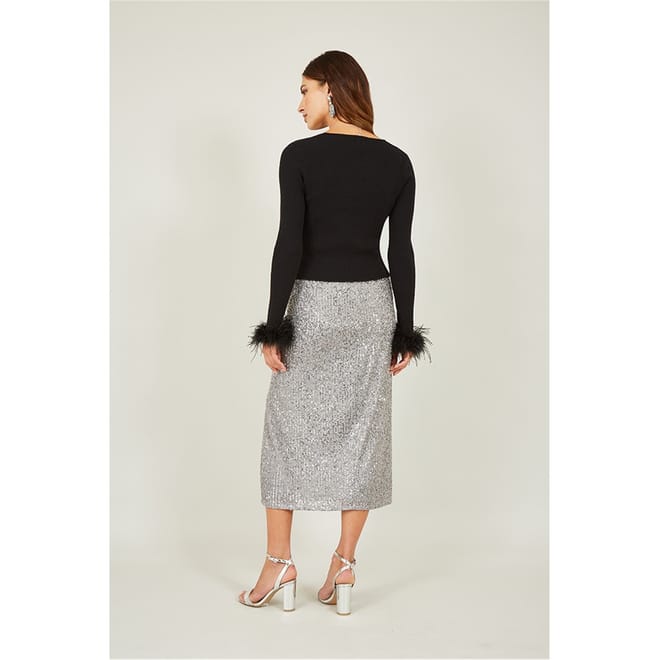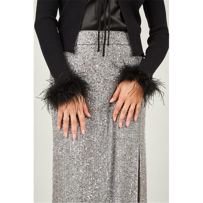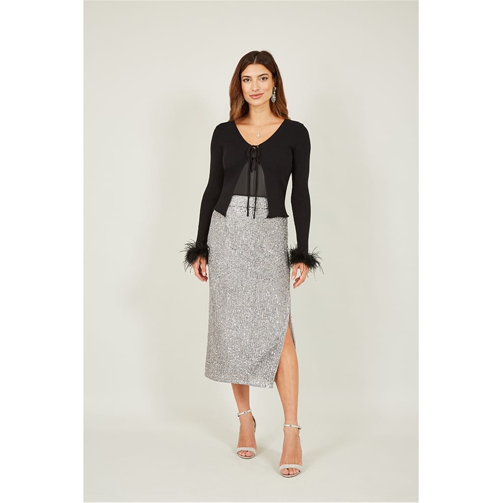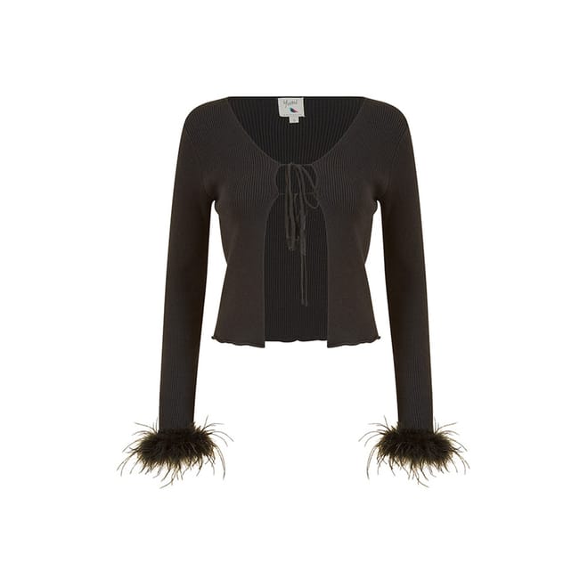 Impactful dressing can be achieve with comfort and style all tied up. This ribbed bolero from Yumi is the perfect marriage of sleek and statement style. With full length sleeves that finish with a flourish of feather on the cuff, and double tie front. Style this piece dressed up with a sequinned Cami and flowy wide legs trousers. Size reference, Small 8-10, Medium 10-12, Large 12-14. -